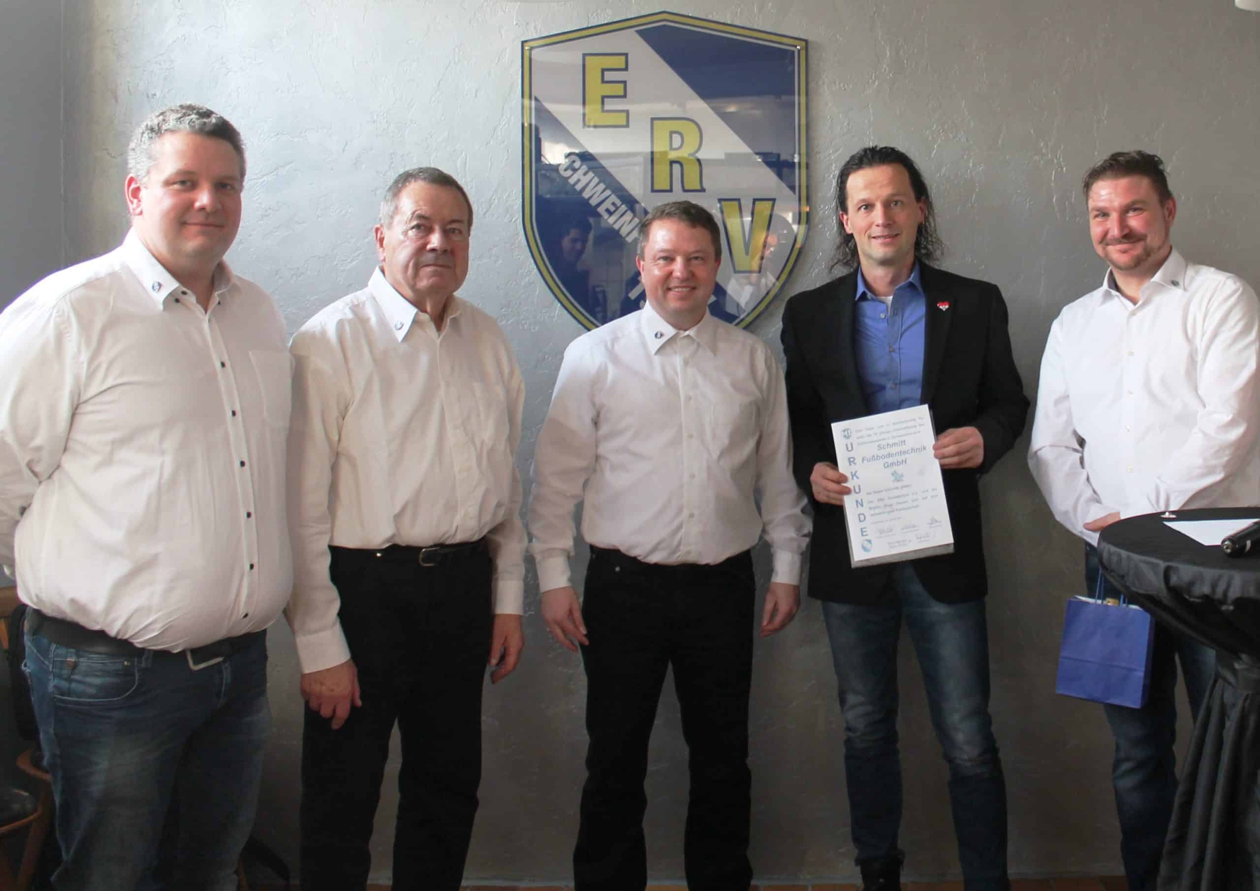 Im Rahmen einer kleiner Feierstunde wurde die Schmitt Fußbodentechnik GmbH für die langjährige Unterstützung der Mighty Dogs Schweinfurt geehrt. Bei einem kurzweiligen Vortrag wurde auf die letzten erfolgreichen Jahre zurückgeblickt – bis hin zum Bau der ersten Kunsteisbahn. Stellvertretend für die Schmitt Fußbodentechnik GmbH, nahm Volker Hummel die Urkunde entgegen. Volker Hummel bedankte sich bei Stefan Graf (1. Vorstand ERV Schweinfurt) für die ehrenamtlich geleistete Arbeit aller Mitglieder beim ERV und wünscht den Migthty Dogs für die Playoffs alles Gute.