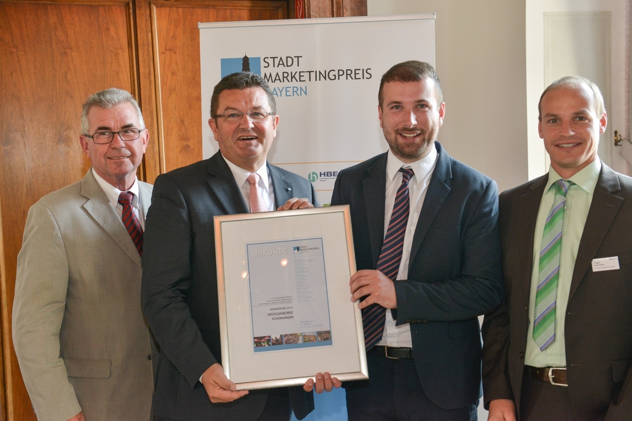 Gemeinsam mit 2. Bürgermeister Rudolf Müller und 3. Bürgermeister Andrè Merz nahm Stefan Rottmann eine Auszeichnung aus den Händen des Staatssekretärs Franz Josef Pschierer entgegen. Alleine die Tatsache, dass es die Großgemeinde auf Anhieb beim bayerischen Stadtmarketingpreis unter die letzten drei Platzierten geschafft hat, macht die Verantwortlichen stolz. „Wir haben keine kostspieligen Werbeagenturen oder können mit Hochglanzmagazinen und Imagefilmen dienen: Mit ‚Köpfchen’ und einer großen Portion Motivation kann man viel improvisieren und erreichen!“, sagt Rottmann und dankte für die Unterstützung in der Gemeindeverwaltung und aus der Bürgerschaft.