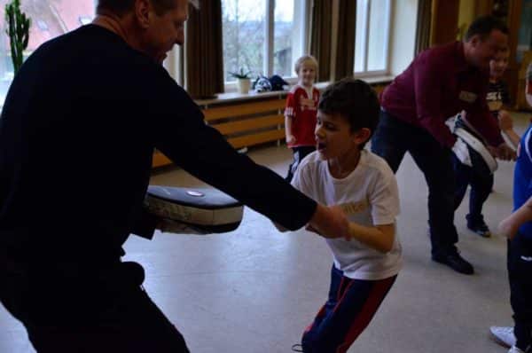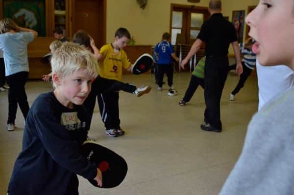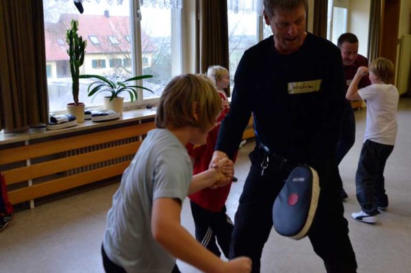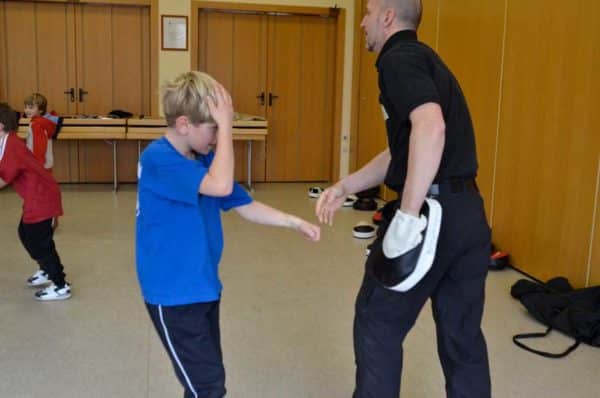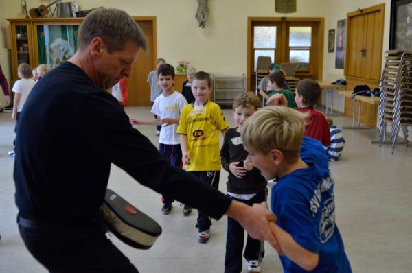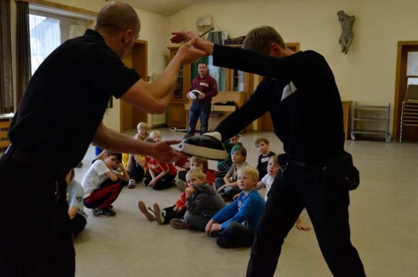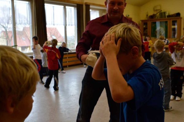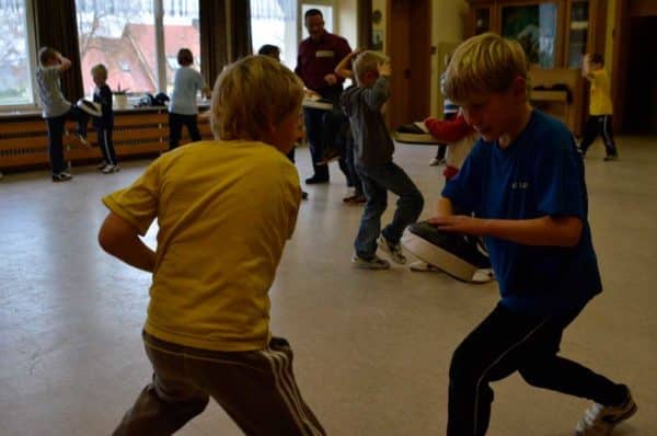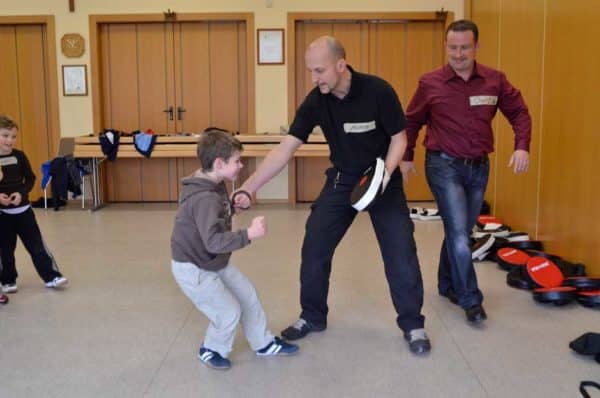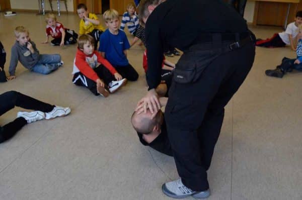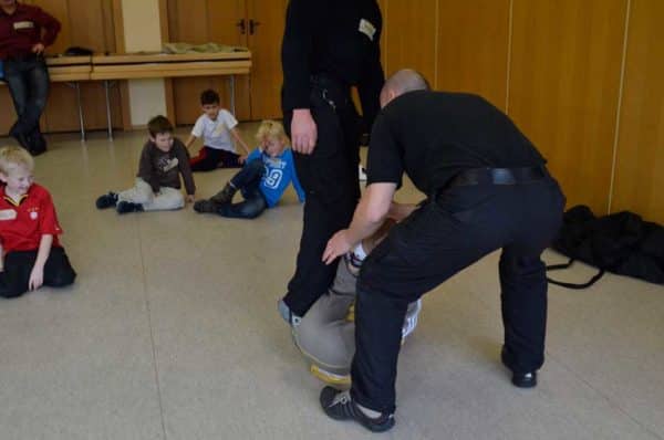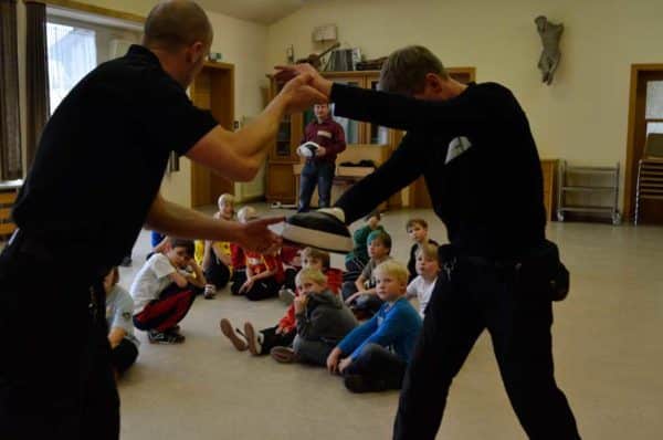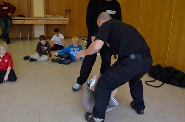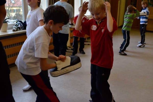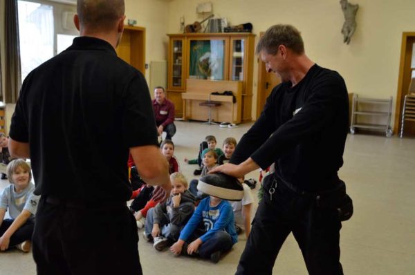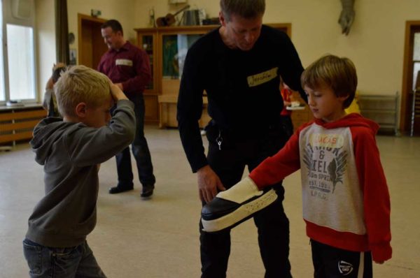 Gefährliche Situationen erkennen und möglichst ausweichen ist immer richtig. Die Notrufnummer sollte ein Kind auch in Stresssituationen sofort abrufen können. Bei den Praxisübungen wurde probiert, wie sich Abstand zu einer anderen Person anfühlt: zwei Schritte Abstand – eine Armlänge Abstand. Dann wurde es richtig handgreiflich. Was tun, wenn man am Arm festgehalten wird oder die Büchertasche festgehalten wird. Die Kinder konnten auf die mit speziellen Anzügen geschützten Polizeitrainer nach Herzenslust einschlagen und treten, immer mit Unterstützung der Stimme, um auf jeden Fall andere Passanten auf den Übergriff aufmerksam zu machen. Die Kids und auch die Trainer waren nach diesem Tag richtig ausgepowert, aber alle waren sich einig, dass auch im nächsten Jahr wieder so ein Kurs stattfinden sollte.