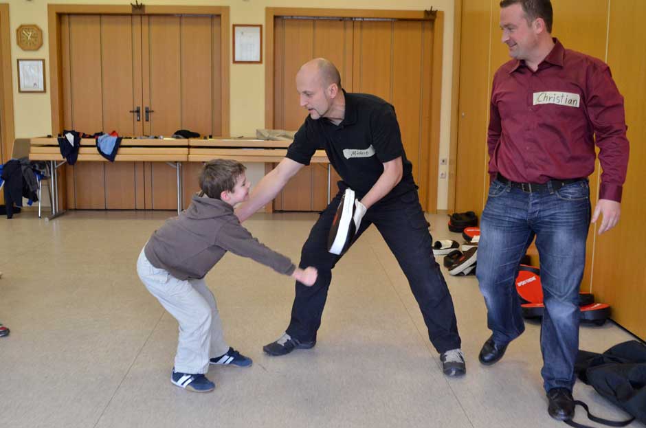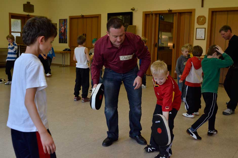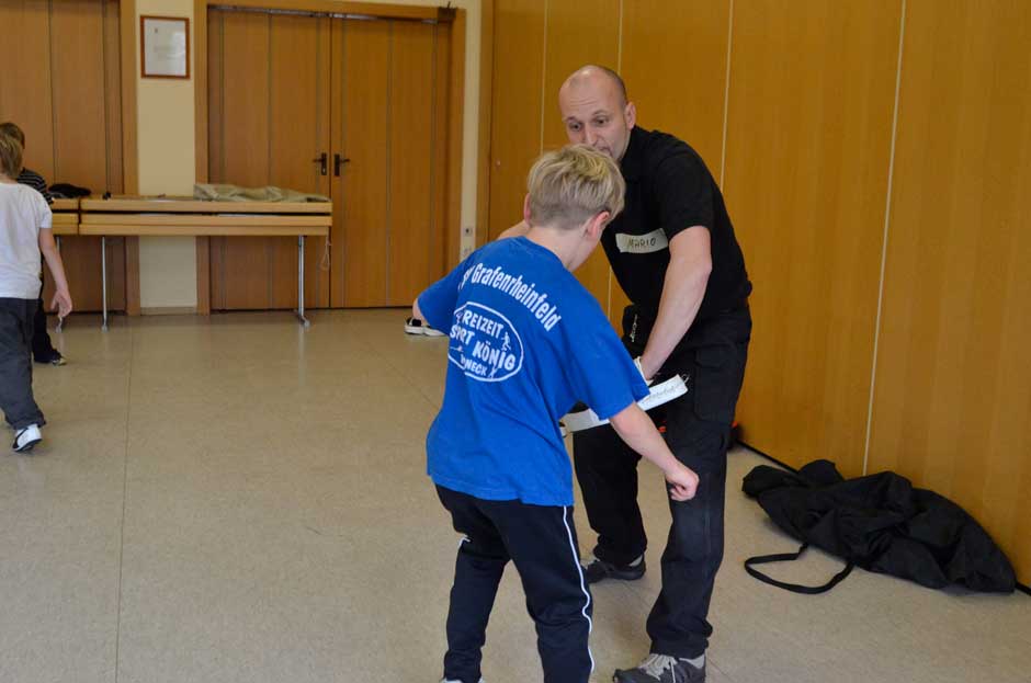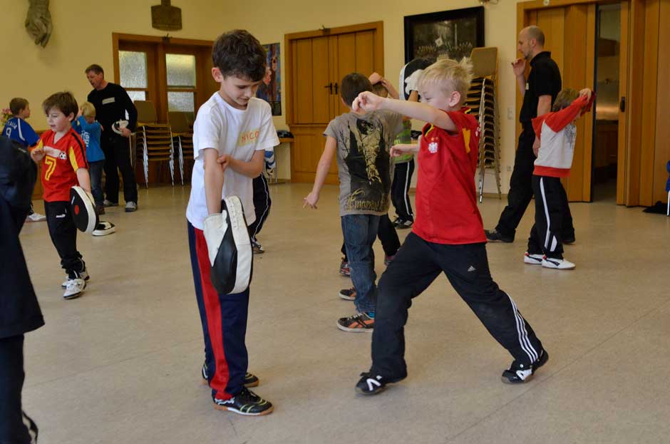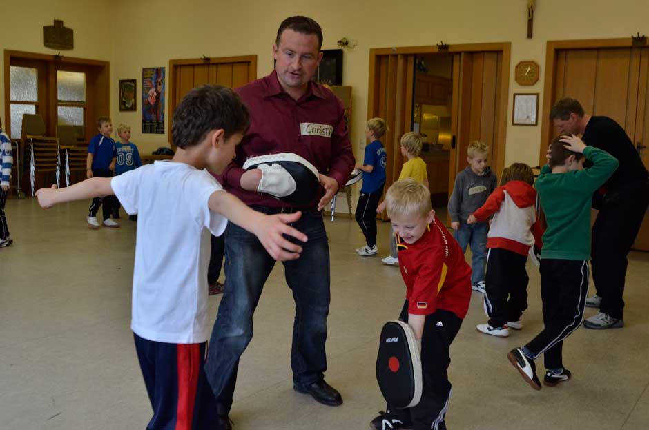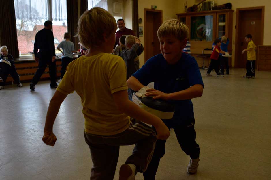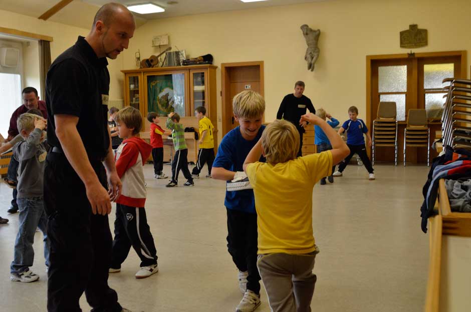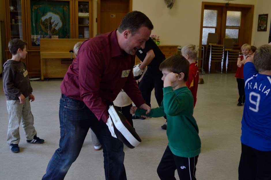 Am Samstag haben sich im kath. Pfarrheim in Grafenrheinfeld 25 Buben zwischen 6 und 8 Jahren eingefunden, um mit Christian und den beiden Polizei-Einsatztrainern, Joachim und Marco, Situationen, die für Kinder im Alltag gefährlich werden können, durch zu spielen. Da ging es hart zur Sache. Im theoretischen Teil wurde erst einmal geklärt, was ist eigentlich Gewalt und wie man Gewalt ohne feig zu sein aus dem Wege gehen kann.