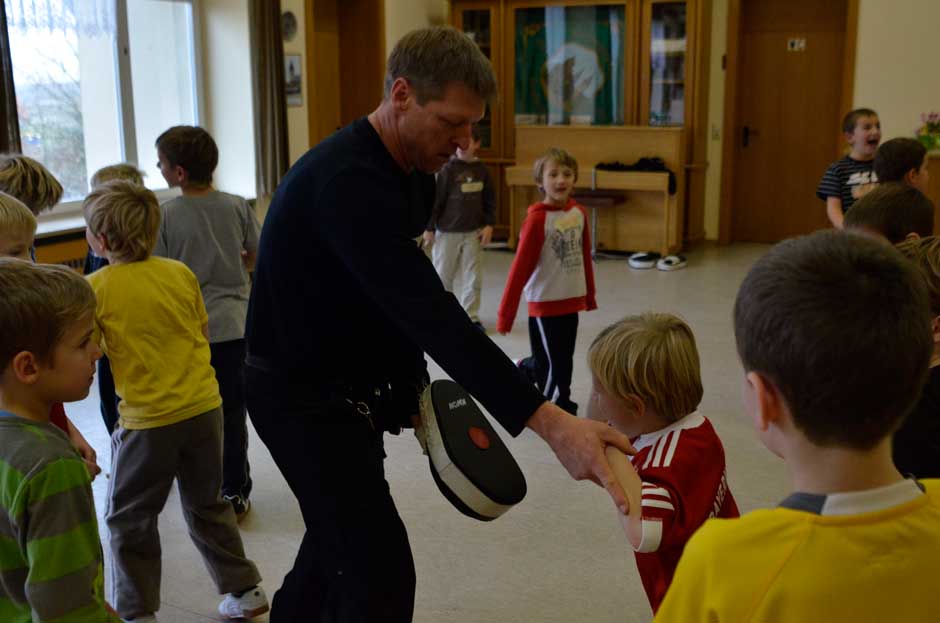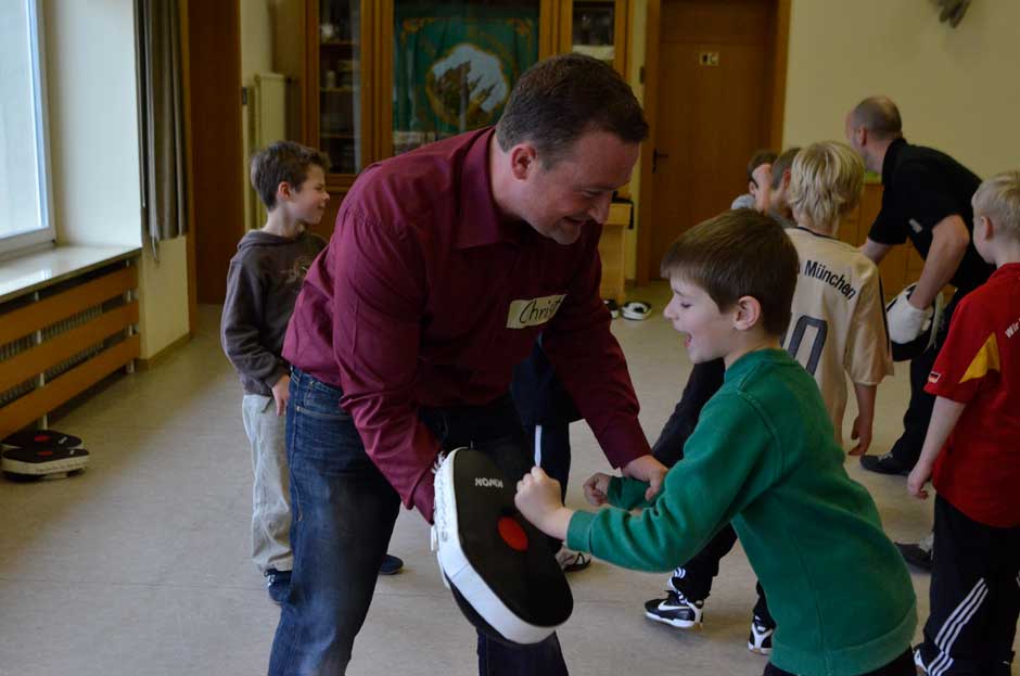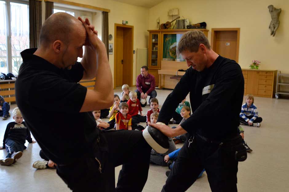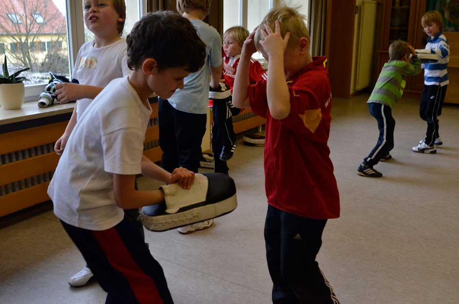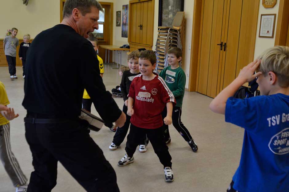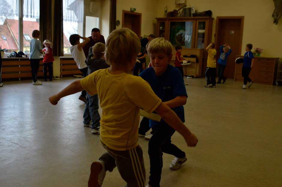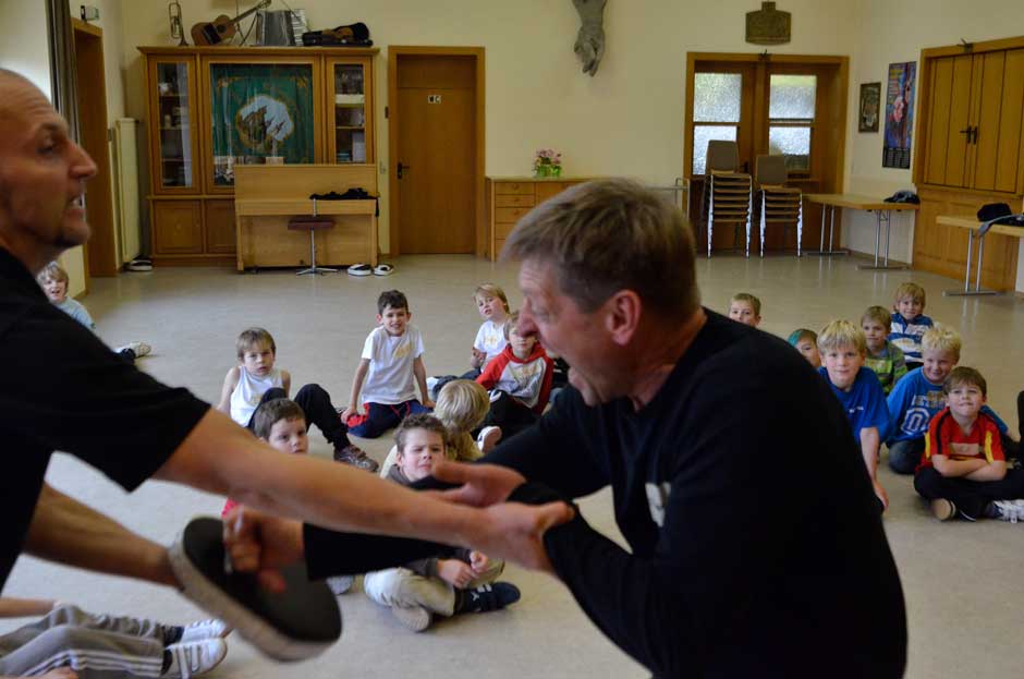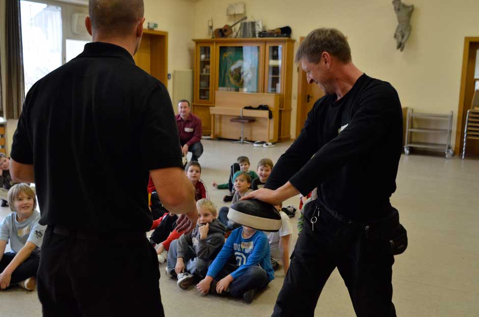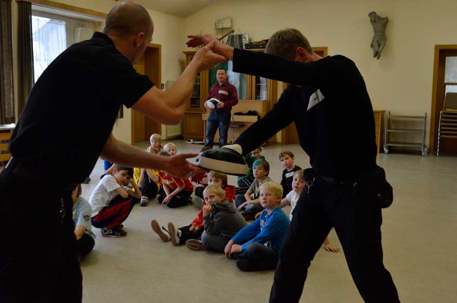 Am Samstag haben sich im kath. Pfarrheim in Grafenrheinfeld 25 Buben zwischen 6 und 8 Jahren eingefunden, um mit Christian und den beiden Polizei-Einsatztrainern, Joachim und Marco, Situationen, die für Kinder im Alltag gefährlich werden können, durch zu spielen. Da ging es hart zur Sache. Im theoretischen Teil wurde erst einmal geklärt, was ist eigentlich Gewalt und wie man Gewalt ohne feig zu sein aus dem Wege gehen kann.