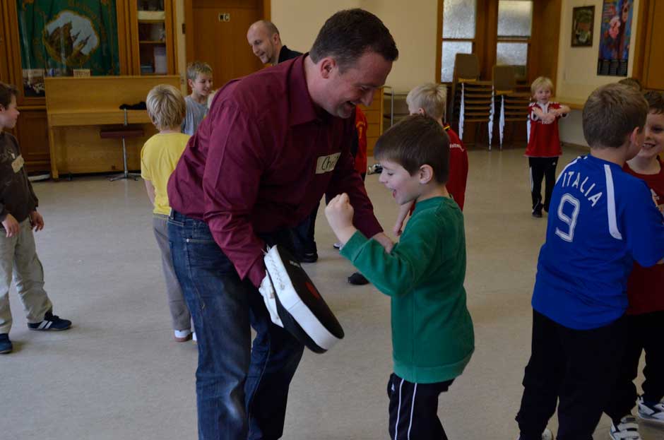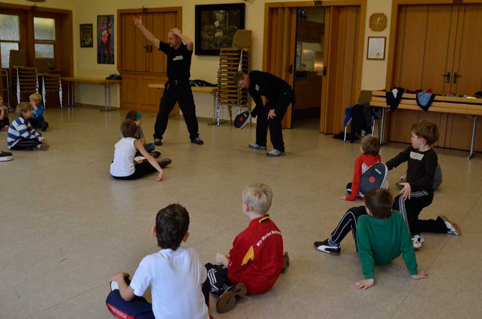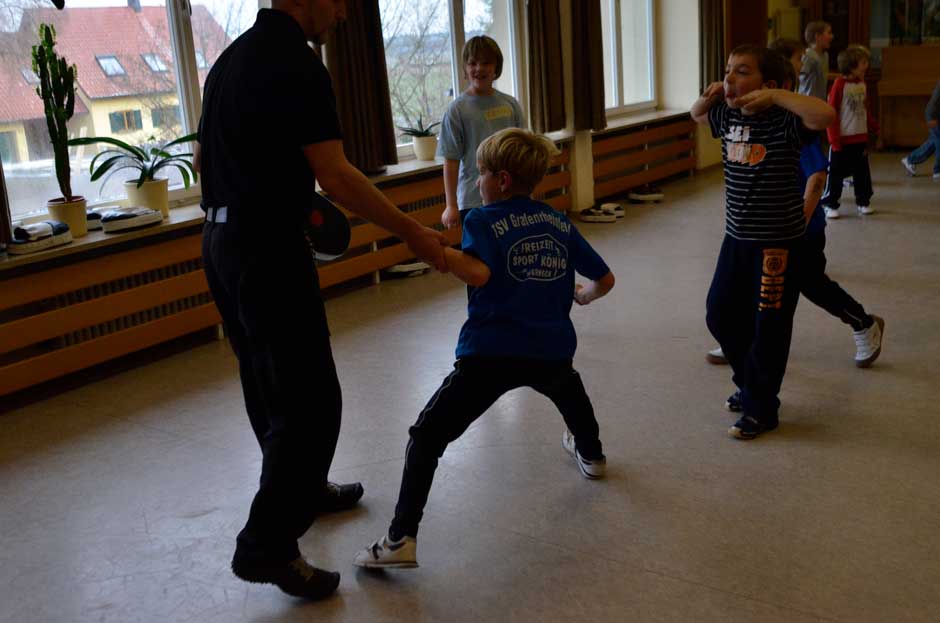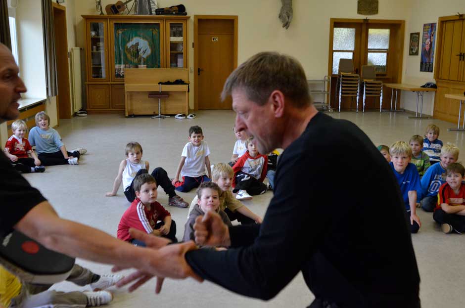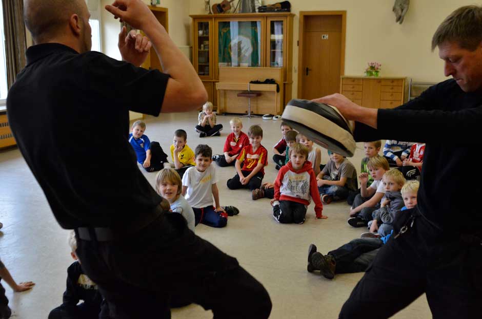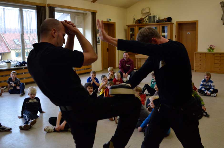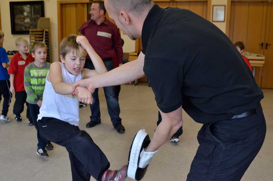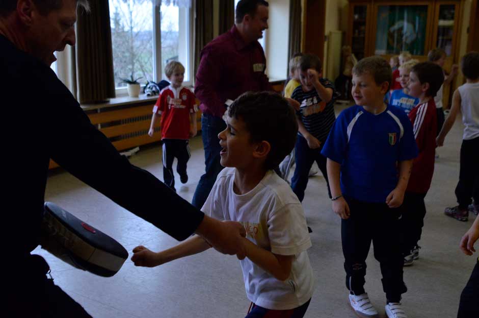 Am Samstag haben sich im kath. Pfarrheim in Grafenrheinfeld 25 Buben zwischen 6 und 8 Jahren eingefunden, um mit Christian und den beiden Polizei-Einsatztrainern, Joachim und Marco, Situationen, die für Kinder im Alltag gefährlich werden können, durch zu spielen. Da ging es hart zur Sache. Im theoretischen Teil wurde erst einmal geklärt, was ist eigentlich Gewalt und wie man Gewalt ohne feig zu sein aus dem Wege gehen kann.
