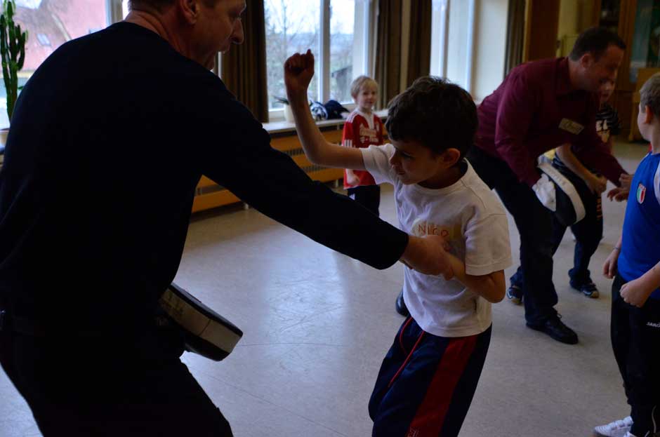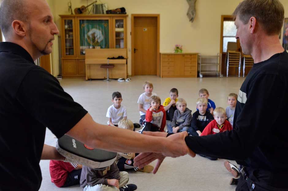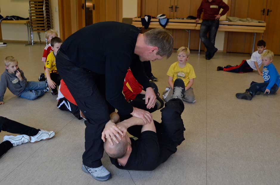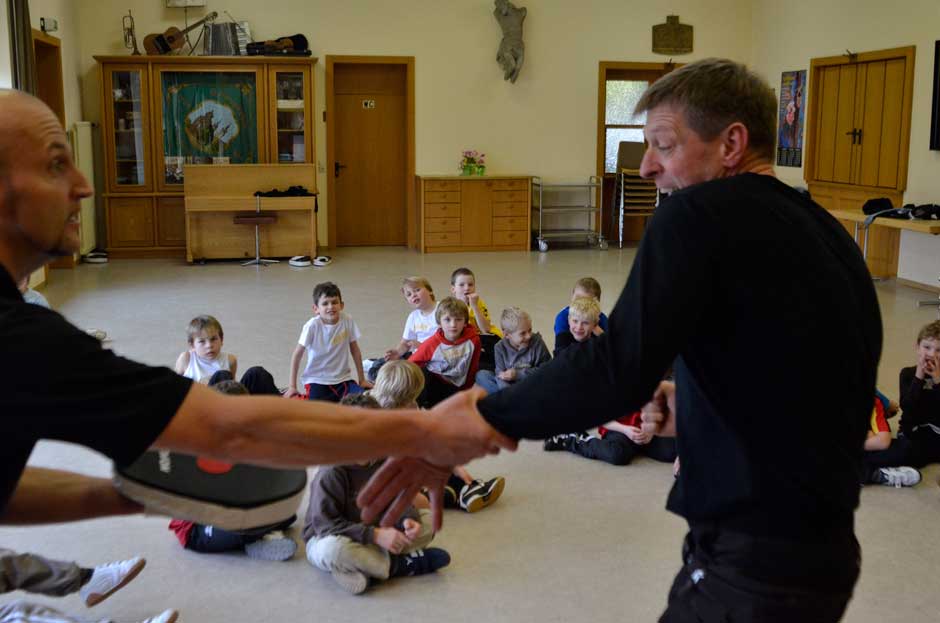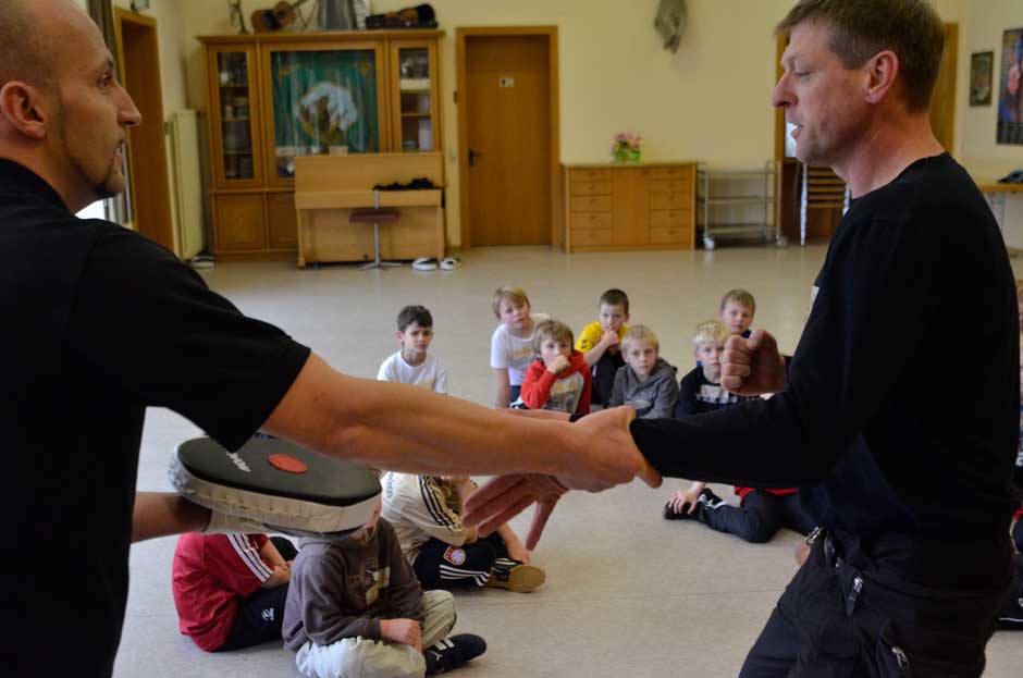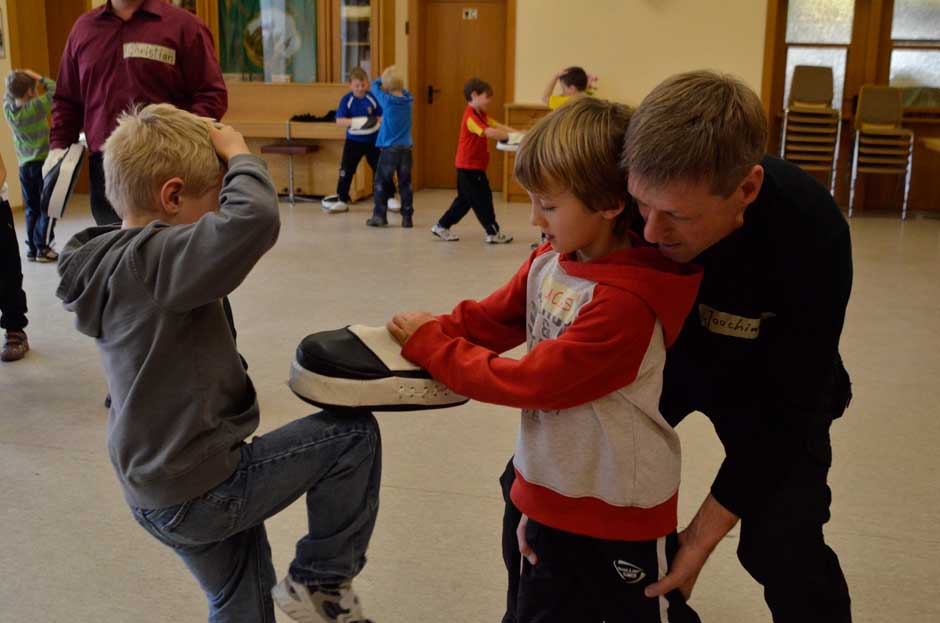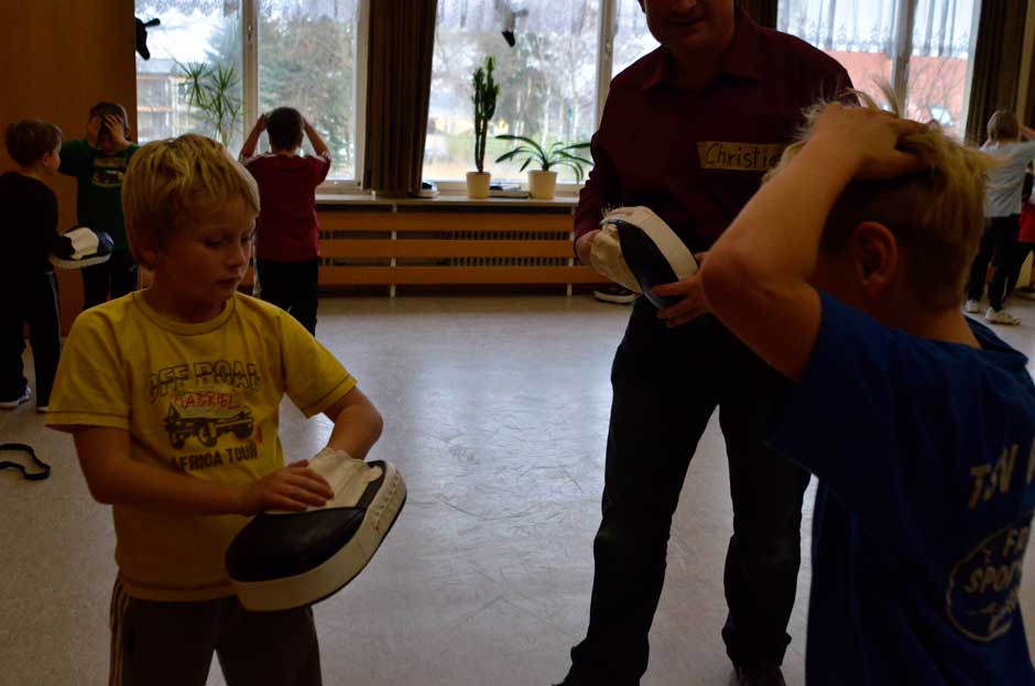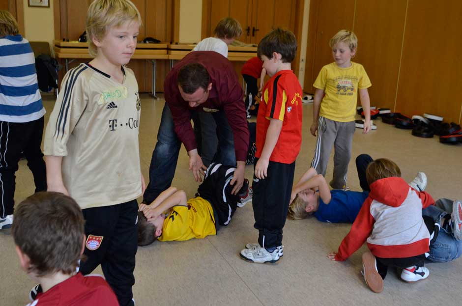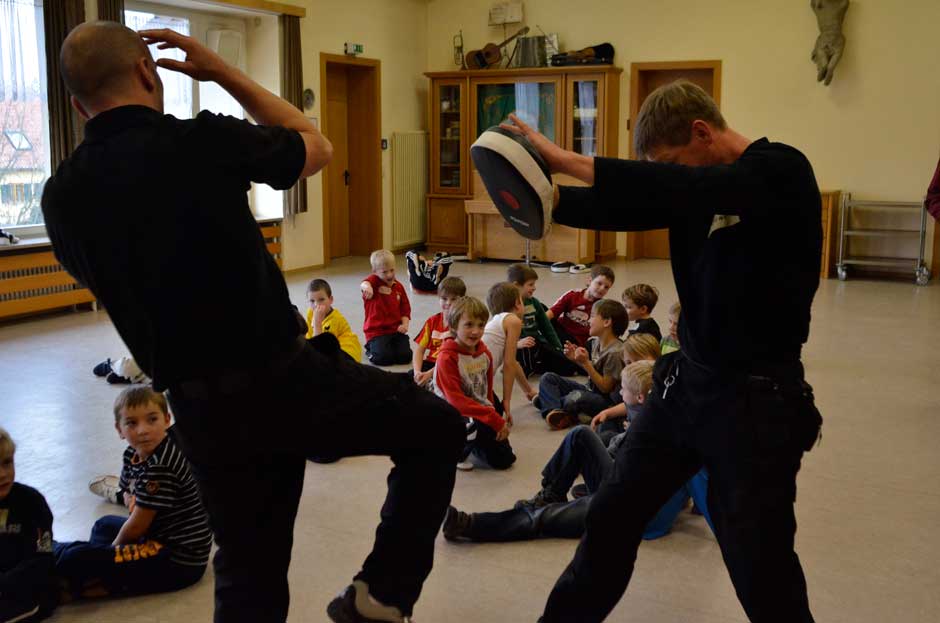 Am Samstag haben sich im kath. Pfarrheim in Grafenrheinfeld 25 Buben zwischen 6 und 8 Jahren eingefunden, um mit Christian und den beiden Polizei-Einsatztrainern, Joachim und Marco, Situationen, die für Kinder im Alltag gefährlich werden können, durch zu spielen. Da ging es hart zur Sache. Im theoretischen Teil wurde erst einmal geklärt, was ist eigentlich Gewalt und wie man Gewalt ohne feig zu sein aus dem Wege gehen kann.