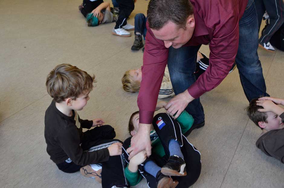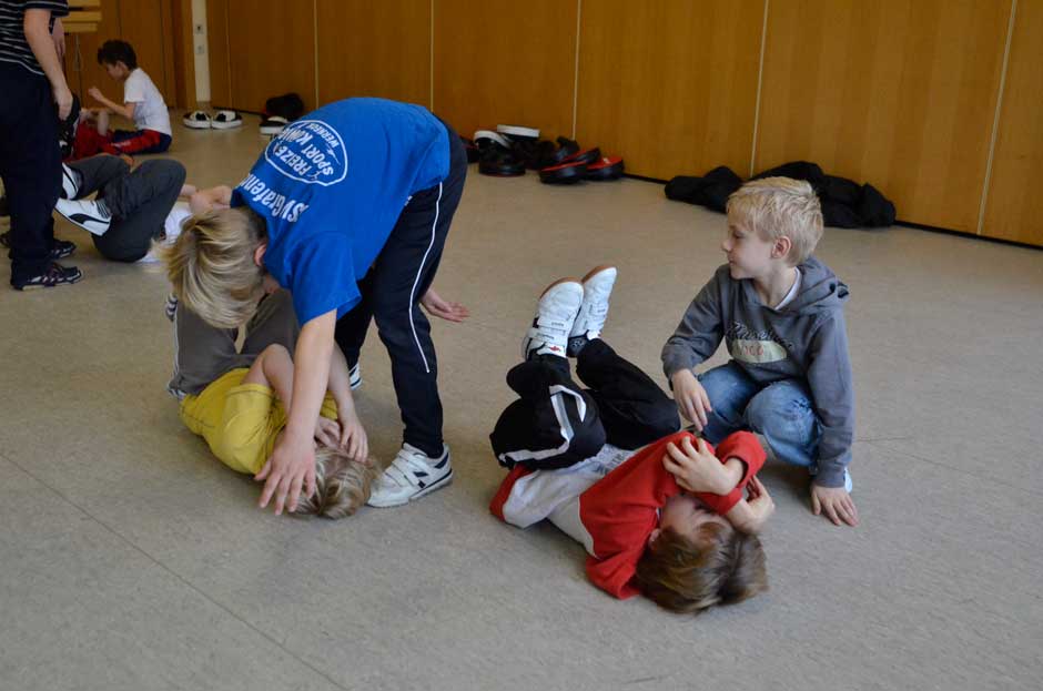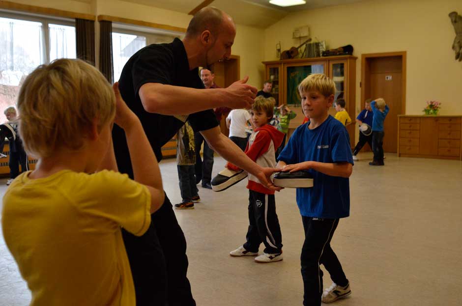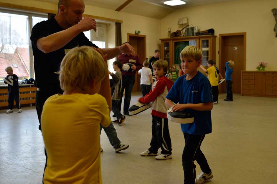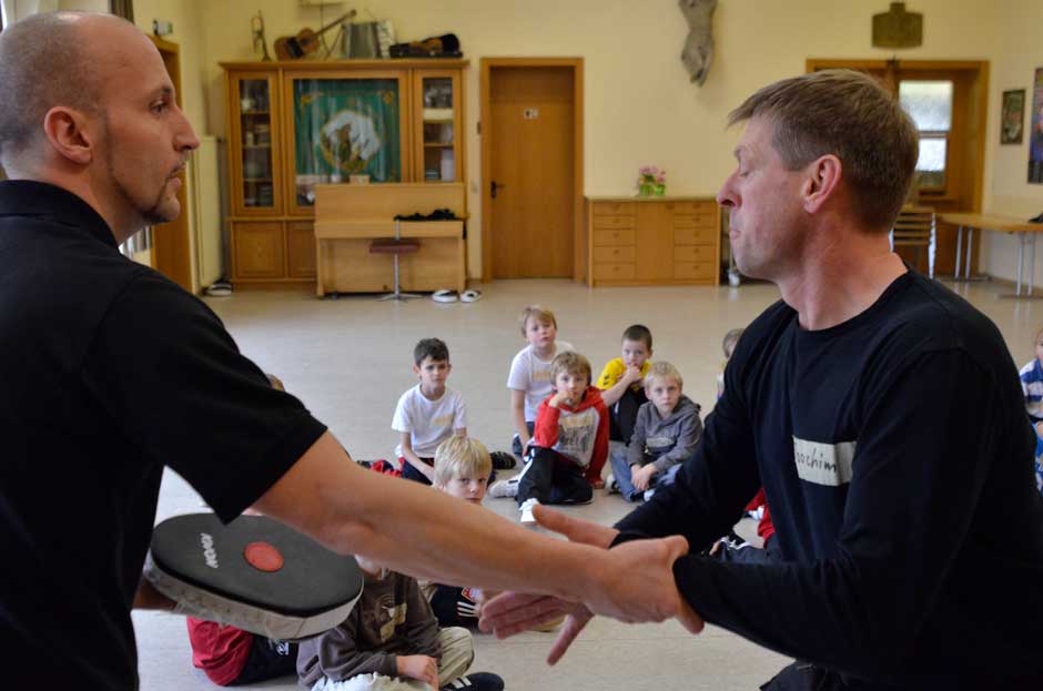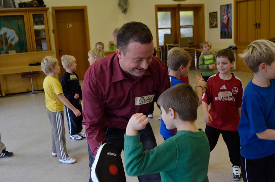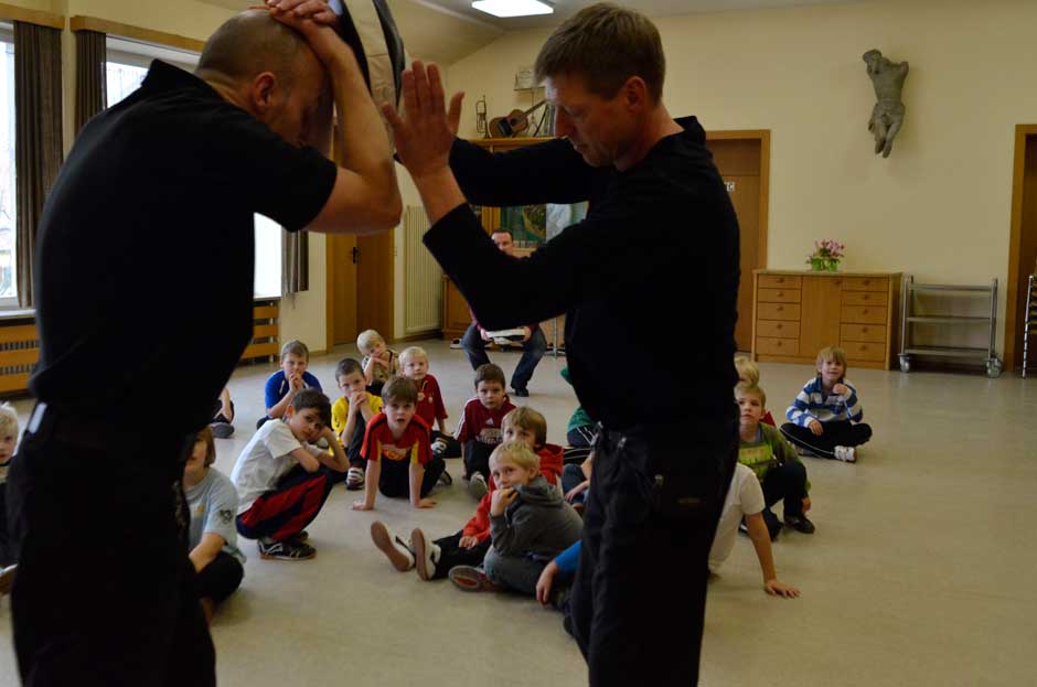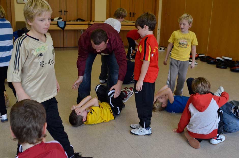 Am Samstag haben sich im kath. Pfarrheim in Grafenrheinfeld 25 Buben zwischen 6 und 8 Jahren eingefunden, um mit Christian und den beiden Polizei-Einsatztrainern, Joachim und Marco, Situationen, die für Kinder im Alltag gefährlich werden können, durch zu spielen. Da ging es hart zur Sache. Im theoretischen Teil wurde erst einmal geklärt, was ist eigentlich Gewalt und wie man Gewalt ohne feig zu sein aus dem Wege gehen kann.