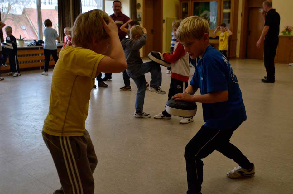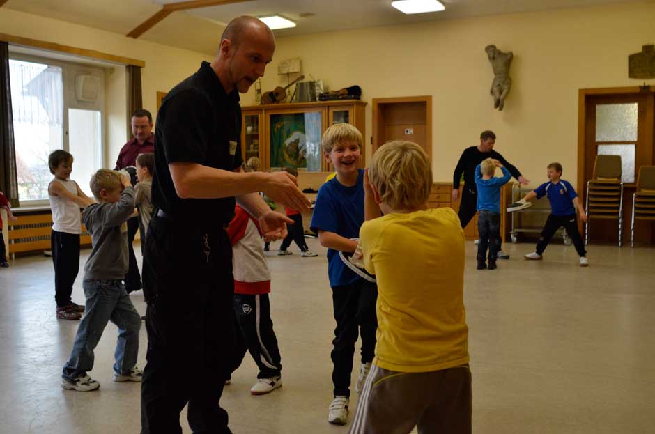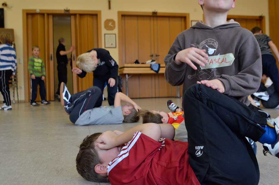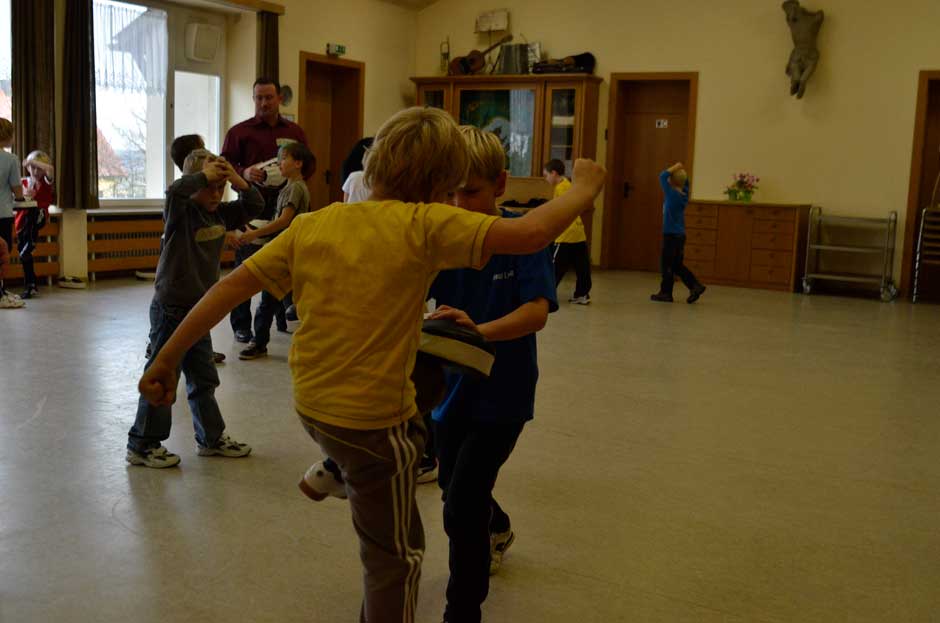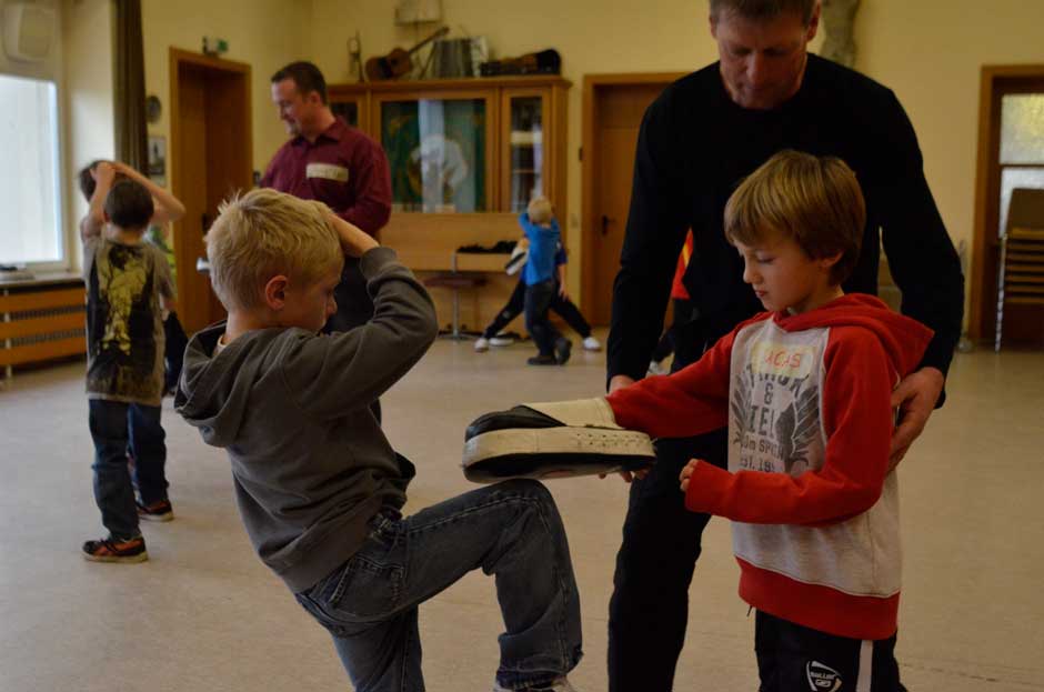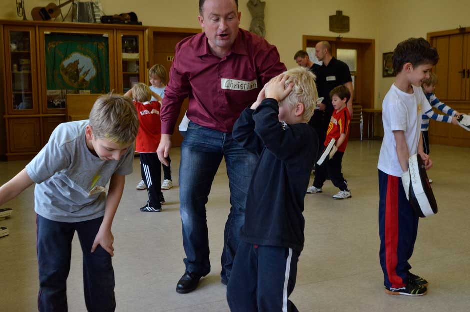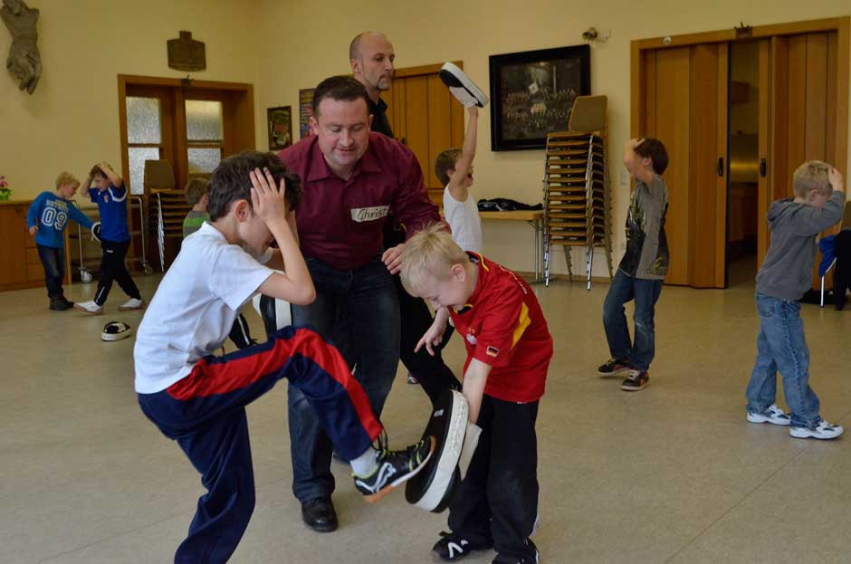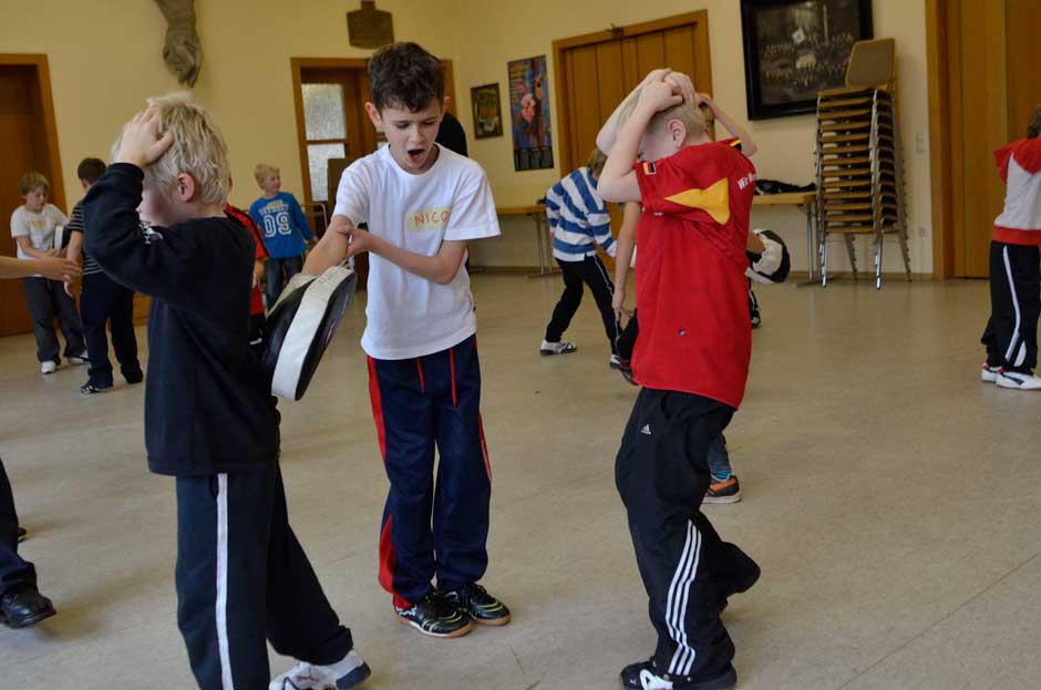 Ganz wichtig ist das Wort „Nein”. Kinder haben das Recht über sich selbst zu entscheiden und dürfen auch Erwachsenen gegenüber „Nein” sagen. Dass dabei die Entschiedenheit der Stimme und die Lautstärke eine entscheidende Rolle spielt, war den Kindern schnell klar. Richtig und laut genug schreien will geübt sein. So haben dann auch die Wände im Pfarrheim richtig gewackelt und die Stimmbänder der Kids gehörten neben Arm und Beinmuskeln zu den am meisten strapazierten Körperteilen.