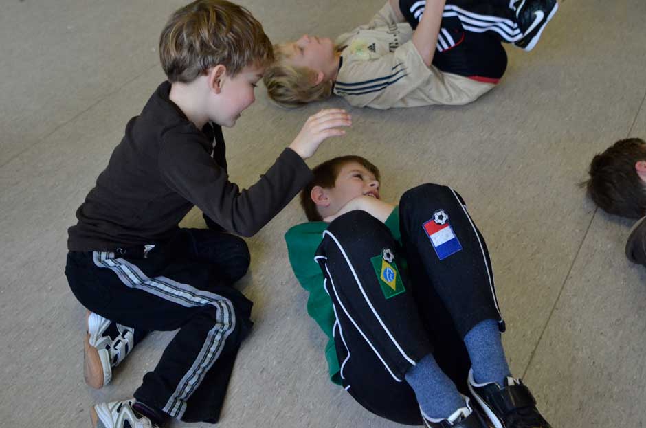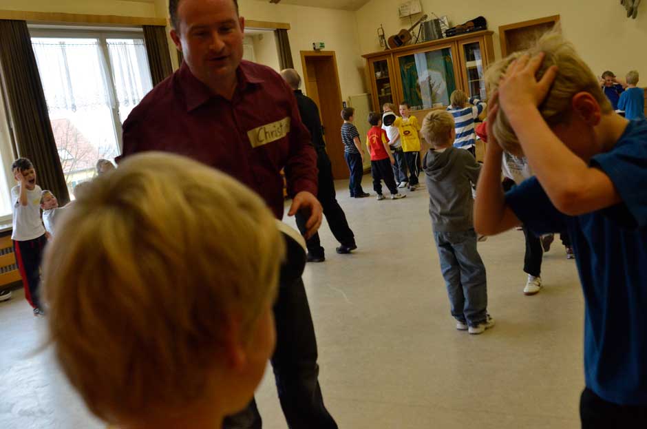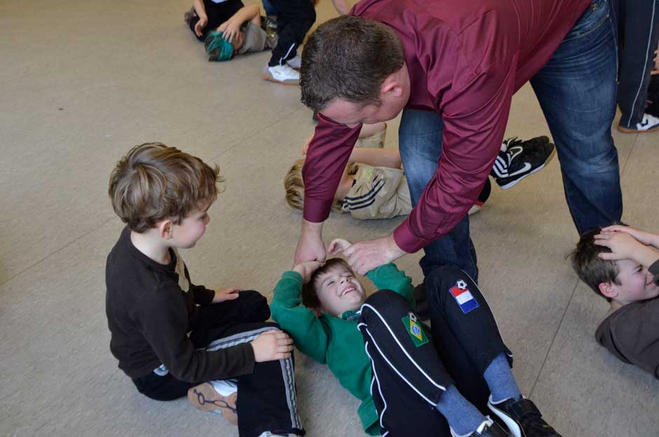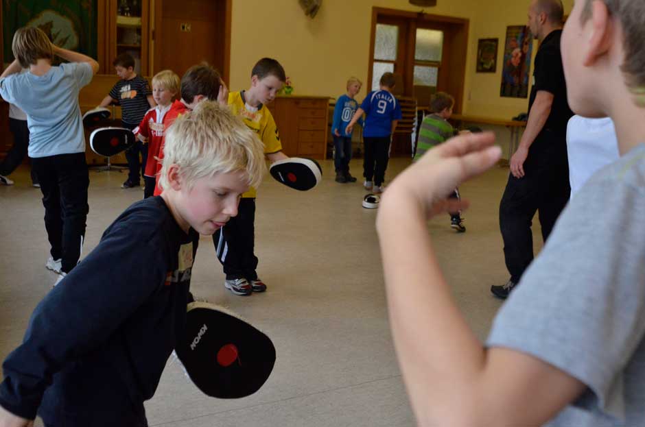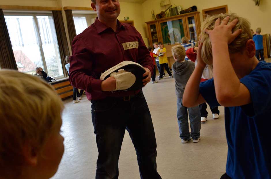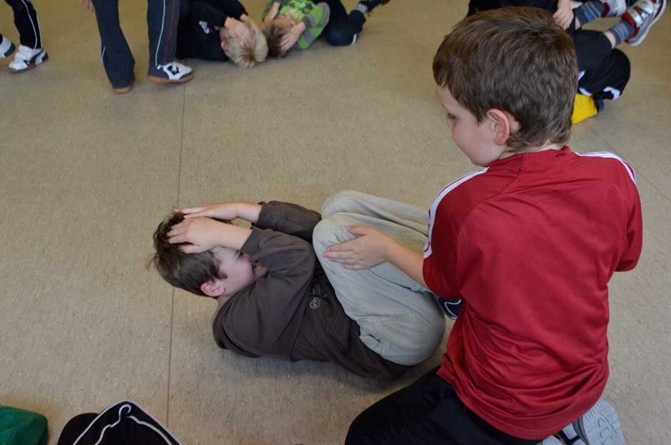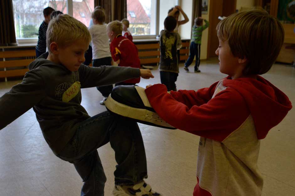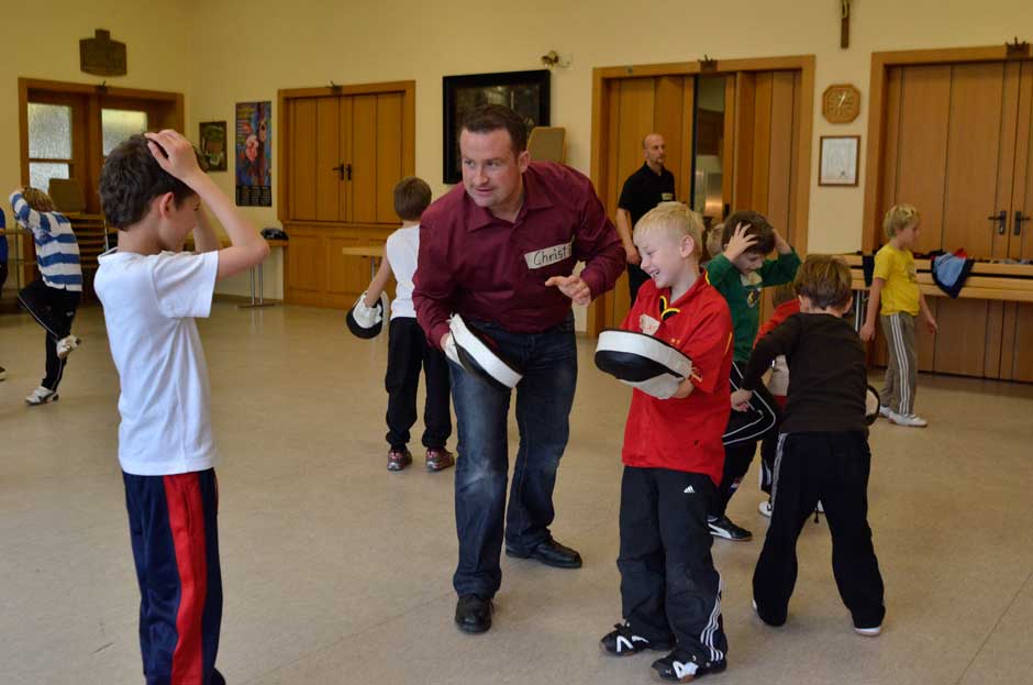 Ganz wichtig ist das Wort „Nein”. Kinder haben das Recht über sich selbst zu entscheiden und dürfen auch Erwachsenen gegenüber „Nein” sagen. Dass dabei die Entschiedenheit der Stimme und die Lautstärke eine entscheidende Rolle spielt, war den Kindern schnell klar. Richtig und laut genug schreien will geübt sein. So haben dann auch die Wände im Pfarrheim richtig gewackelt und die Stimmbänder der Kids gehörten neben Arm und Beinmuskeln zu den am meisten strapazierten Körperteilen.