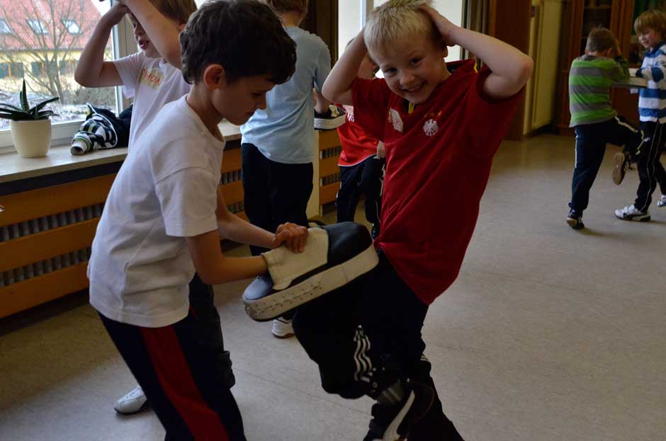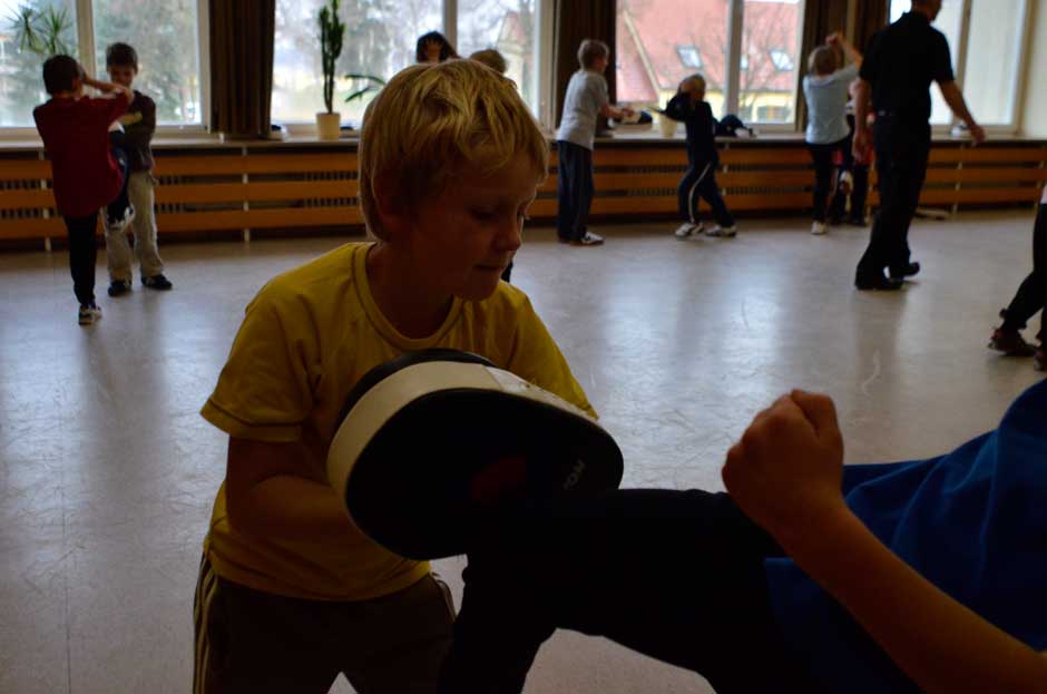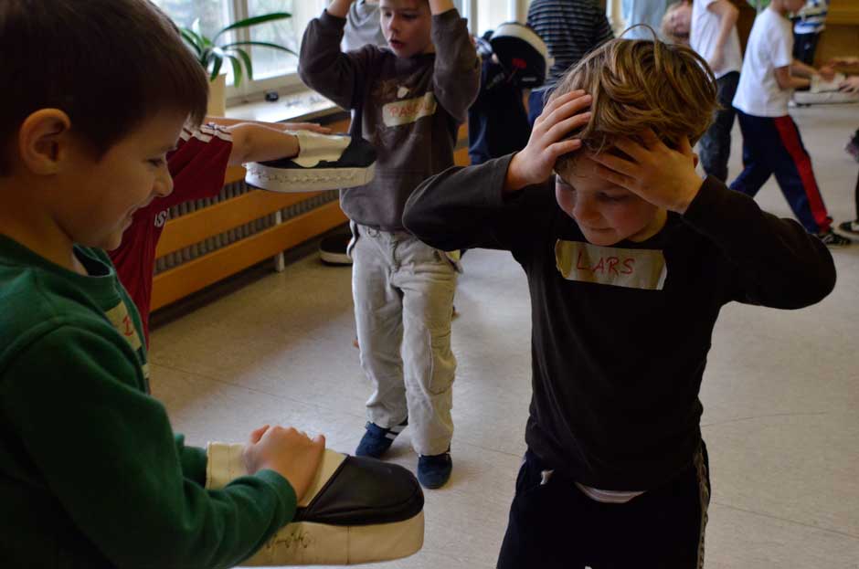 Gefährliche Situationen erkennen und möglichst ausweichen ist immer richtig. Die Notrufnummer sollte ein Kind auch in Stresssituationen sofort abrufen können. Bei den Praxisübungen wurde probiert, wie sich Abstand zu einer anderen Person anfühlt: zwei Schritte Abstand – eine Armlänge Abstand. Dann wurde es richtig handgreiflich. Was tun, wenn man am Arm festgehalten wird oder die Büchertasche festgehalten wird. Die Kinder konnten auf die mit speziellen Anzügen geschützten Polizeitrainer nach Herzenslust einschlagen und treten, immer mit Unterstützung der Stimme, um auf jeden Fall andere Passanten auf den Übergriff aufmerksam zu machen. Die Kids und auch die Trainer waren nach diesem Tag richtig ausgepowert, aber alle waren sich einig, dass auch im nächsten Jahr wieder so ein Kurs stattfinden sollte.