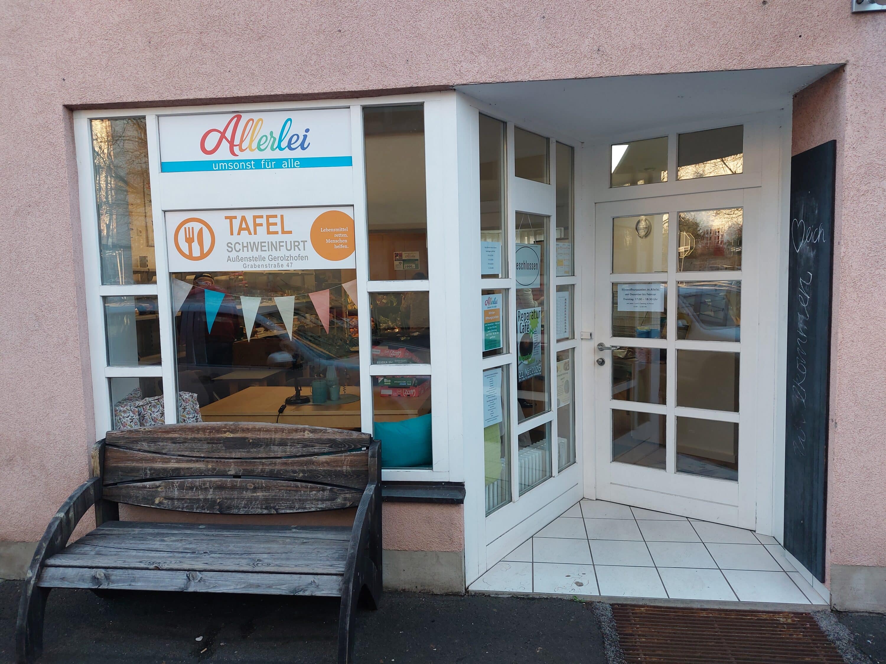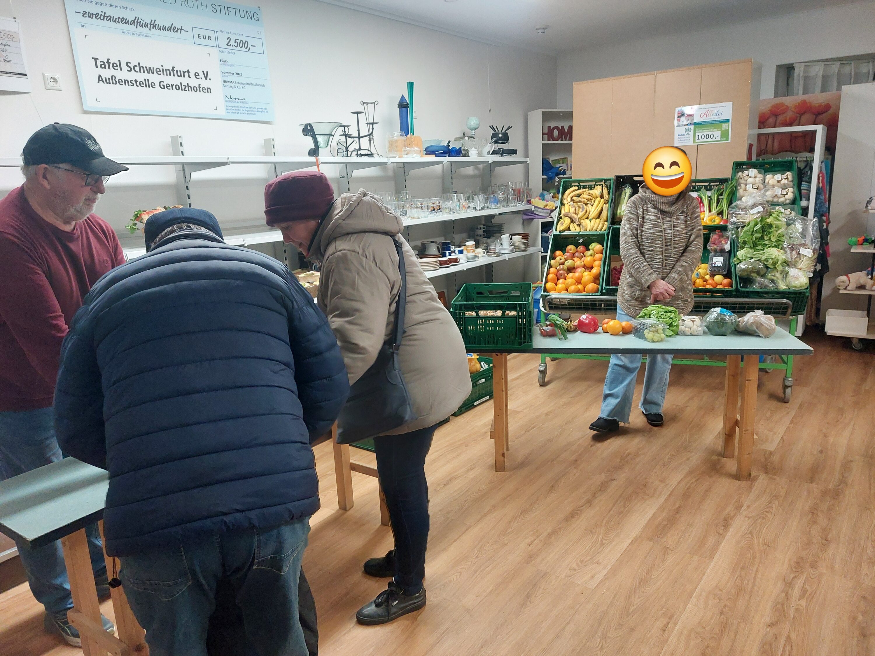 In Gerolzhofen hat der Tafelladen in der Grabenstr. 47 jeden Donnerstag von 18.30 Uhr bis 19.30 Uhr geöffnet. Dort helfen regelmäßig 13 Ehrenamtliche, die in ihrer Freizeit jede Woche den Tafelladen für derzeit ca. 60 Menschen öffnen. Für die Tafelkunden stehen Obst, Gemüse, Backwaren, Milchprodukte, manchmal auch verpackte Wurst und Käse, Nudeln und Konserven bereit. Die Lebensmittel sind sortiert und einwandfrei, verfügen aber teilweise über eine geringere Haltbarkeit. Die auszugebenden Lebensmittel werden einerseits von den Ehrenamtlichen der Tafel aus Schweinfurt angeliefert. Es spenden aber auch Bäckereien in und um Gerolzhofen und auch Lebensmittelgeschäfte. Jede Geld-, Sach- oder Zeitspende hilft der Tafel weiter für ihre Kundinnen und Kunden da zu sein.