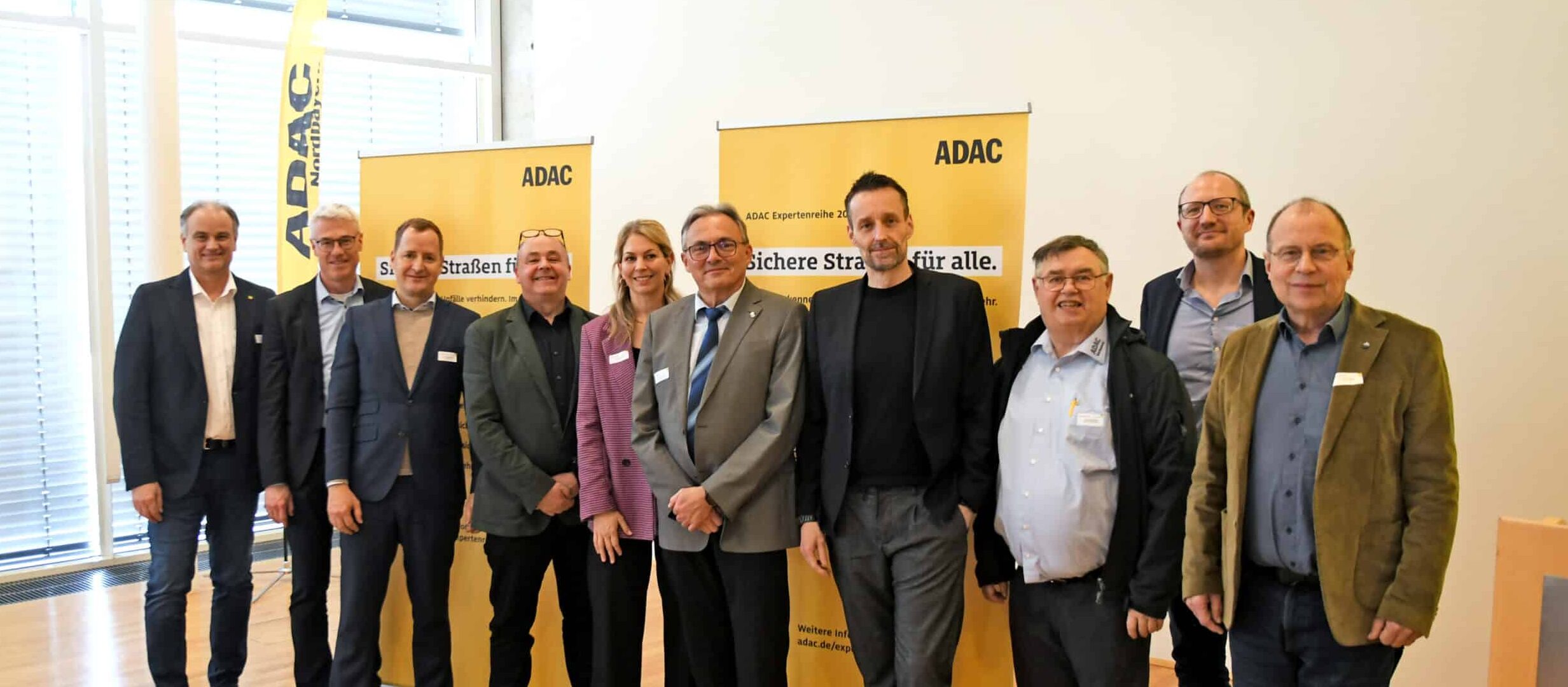Titelbild Gruppenbild der Referentinnen und Referenten (v.l.n.r.: Peter Hübner, stellv. Vorsitzender und Vorstandsmitglied für Verkehr beim ADAC Nordbayern e.V., Alexander Kreipl, Verkehrs- und umweltpolitischer Sprecher beim ADAC Südbayern e.V., Ulrich Chiellino, ADAC e.V., Frank Hahn, ADAC e.V., Dr. Annika Nohe, ADAC Stiftung, POR Bernd Weinmann, Hochschule für den öffentlichen Dienst in Bayern, Michael Vieten, IGS Ingenieurgesellschaft Stolz mbH, Carl-Eugen Metz, Vorstandsmitglied für Verkehr und Umwelt beim ADAC Württemberg e.V., Dr.-Ing. Hagen Schüller, PTV Transport Consult GmbH und EPHK a. D. Thomas Maile)