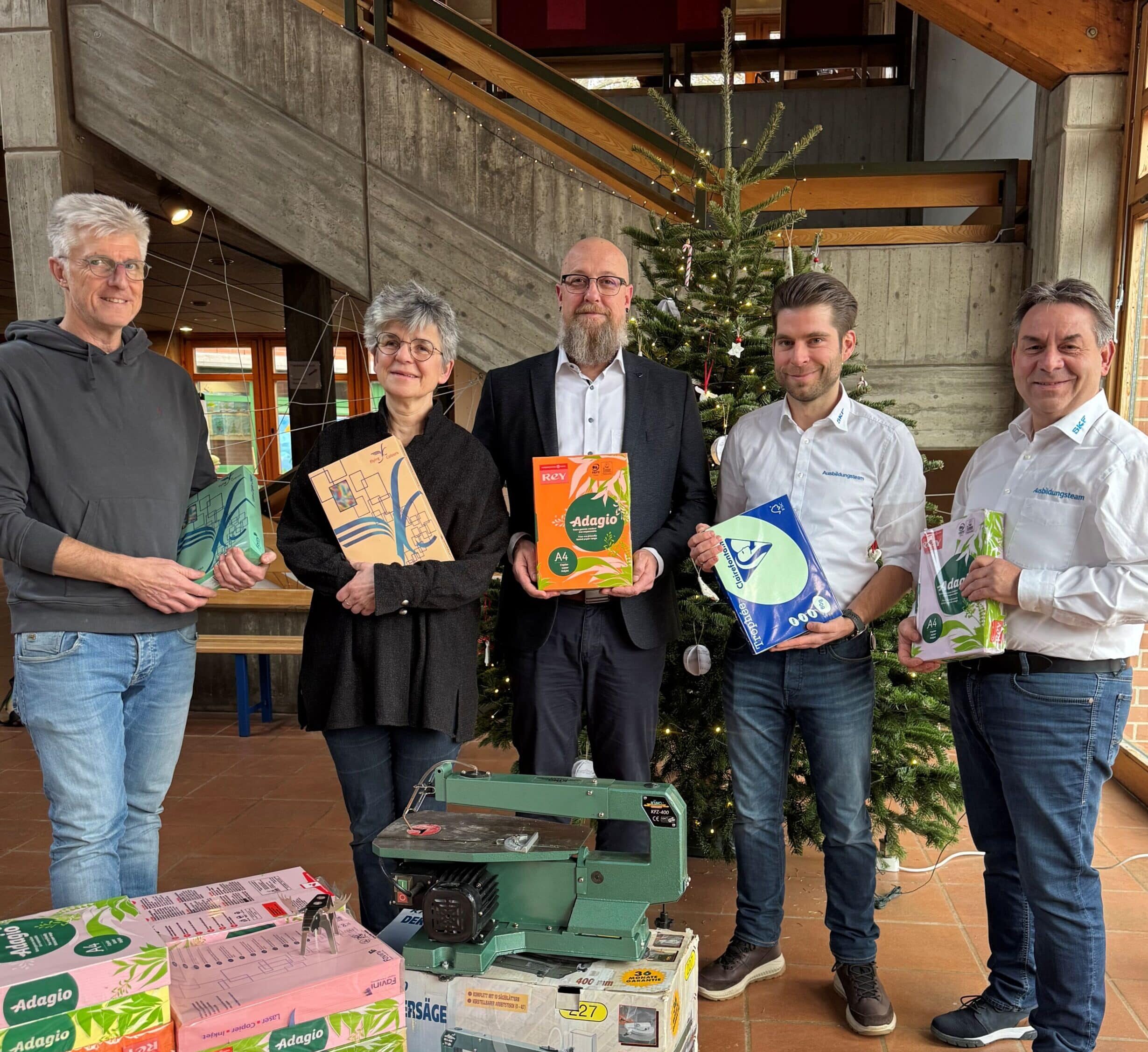Foto: Noch unterm Weihnachtsbaum fand im alten Jahr die Übergabe Tausender Blätter Buntpapier und einer elektrischen Dekupiersäge von SKF an die Franziskus-Förderschule statt. Unser Foto zeigt von links Werkleiter Michael Friedrich, Schulleiterin Margit Lesch, den Leiter der heilpädagogischen Tagesstätte, Jason Vickodil sowie die SKF-Ausbilder Christian Büttner und Matthias Pun
