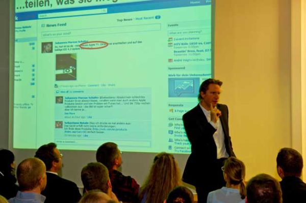 Seine Doktorarbeit hat er über die Industrialisierung in Oberschlesien im 18. und 19. Jahrhundert geschrieben. Damit hat er sich auf seine überaus humorvolle und unterhaltsame Art als der Mann für’s Internet eingeführt. „Wir erleben etwas, mit diesen neuen Medien, was den größten Wandel in der Kommunikation seit Erfindung des Druckes für die Massen darstellt.” Die Folie, die er zu diesem Eingangsstatement an die Wand projizierte, trägt den Titel ‚Verstehen oder untergehen‘. Die Frage: „Was können wir dagegen tun?”, hält er für die falsche. „Wir können nichts dagegen tun, wir können uns nur anpassen. Hier löst nicht eine Technologie die andere ab, hier ändert sich die Art der Kommunikation”, so der Professor und das ohne Rücksicht auf die Branche, das ist ein kompletter Strukturwandel. Werbung wird sich komplett verändern. Empfehlungen von ‚Freunden‘ bei Facebook werden einen höheren Stellenwert bekommen als die bisher übliche Werbung mit der ‚Gießkanne‘. „Empfohlen wird nur etwas, was die Leute gut finden.” Das ist für Unternehmen recht mühsam, lohnt sich aber, weil die von Skibicki aufgezeichneten Streuverluste damit wegfallen. Facebook ist nach seiner Ansicht kein Verkaufskanal, „das ist hardcore – schwere Kommunikation”. Der Professor hat eine nachdenkliche Zuhörerschaft in die Nacht entlassen, die, aufgefordert zu neuem Denken, sicher ganz viele Hausaufgaben mitgenommen hat.