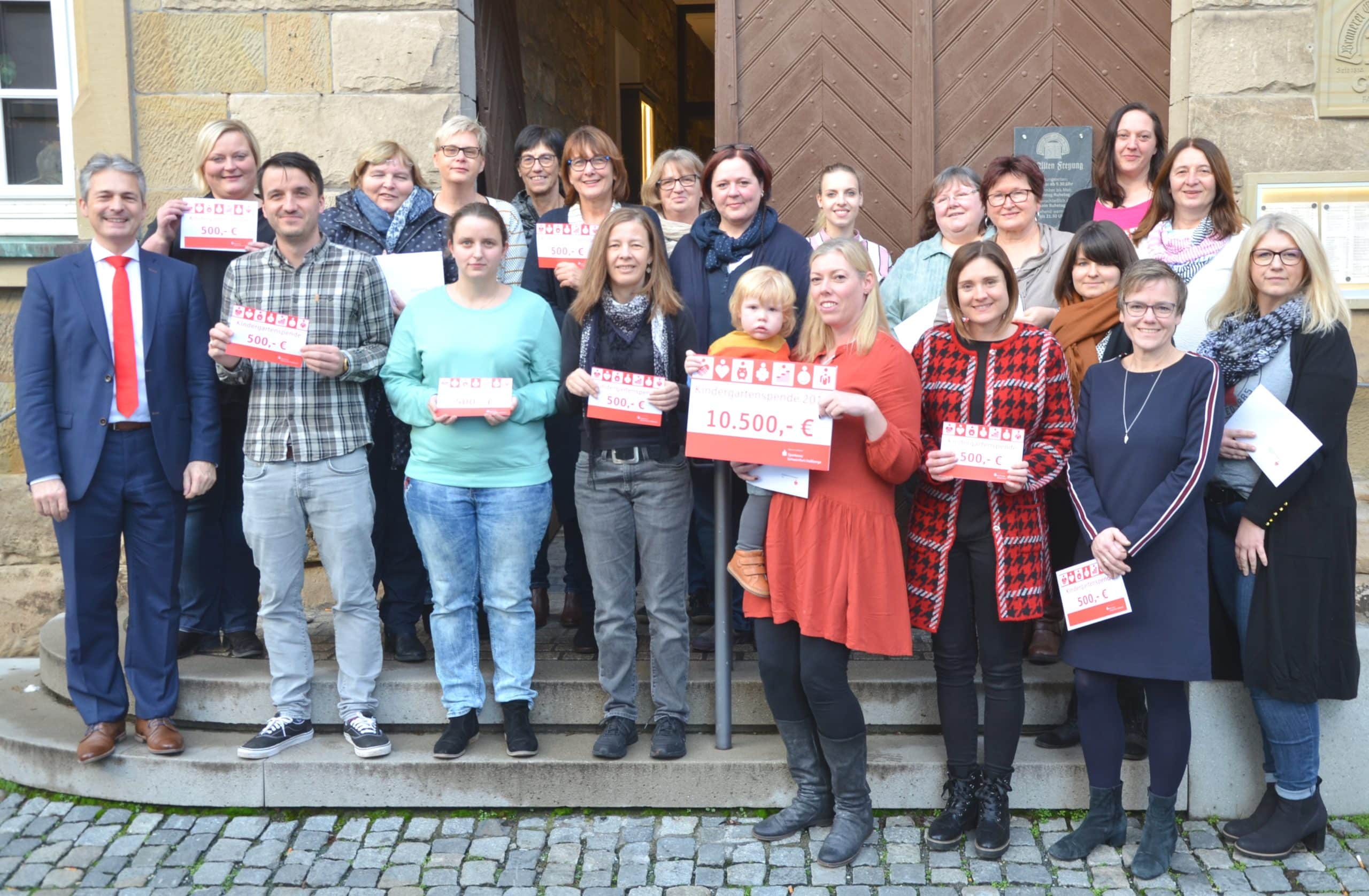 Zeil: Die Sparkasse Schweinfurt-Haßberge fördert regelmäßig die Kindergärten in ihrem Geschäftsgebiet. Im Rahmen einer kleinen Feierstunde erhielten 21 Kindergärten aus den Händen von Peter Schleich, Vorstandsvorsitzender der Sparkasse Schweinfurt-Haßberge, einen symbolischen Spendenscheck in Höhe von jeweils 500 Euro.
