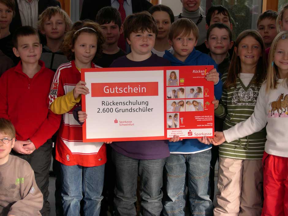 Der bundesweit aktive Verein ‚Aktion Rückenwirbel e.V.’ führt mit speziell geschulten Bewegungsfachkräften eine etwa 20-minütige Aufklärungs- bzw. Einübungsaktion in Schulklassen durch, die vom Bayerischen Staatsministerium ausdrücklich empfohlen wird und für die Staatsminister Dr. Ludwig Spaenle die Schirmherrschaft übernommen hat. Für Schulen in Bayern ist diese Rückenpräventionsmaßnahme kostenfrei, da die Bayerische Sparkassenstiftung als Sponsor gewonnen werden konnte. Diese hat jetzt auch die Kosten für 1.300 Kinder in Stadt und Landkreis Schweinfurt übernommen.