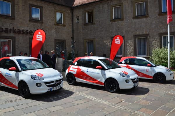 Schweinfurt: Drei neue Opel Adam Eco waren heute im Bürgerhof vor dem Sparkassen-Kundenzentrum Roßmarkt geparkt, sogenannte „Sparkassen-Mobile“. Empfänger der rot-weißen Flitzer sind die Diakonie Schweinfurt, das Antonia-Werr-Zentrum St. Ludwig sowie das Projekt „Harl.e.kin-Nachsorge“ der Caritas-Frühförderstelle in Gerolzhofen. Die Sparkasse Schweinfurt ist eine der ersten Sparkassen, die sich an diesem bayernweiten Projekt beteiligt. Ziel ist es, karitative Einrichtungen in den jeweiligen Regionen mit einem voll ausgerüsteten Auto zu unterstützen. Diese werden dafür verwendet, zu pflege- bzw. nachsorgebedürftigen Menschen zu fahren oder Fahrdienste zu Behörden, Schulen und Ärzten durchzuführen.