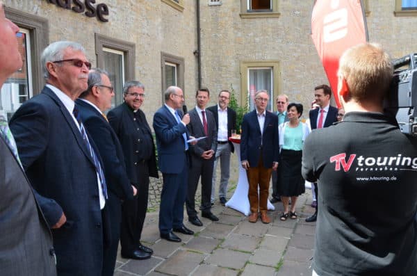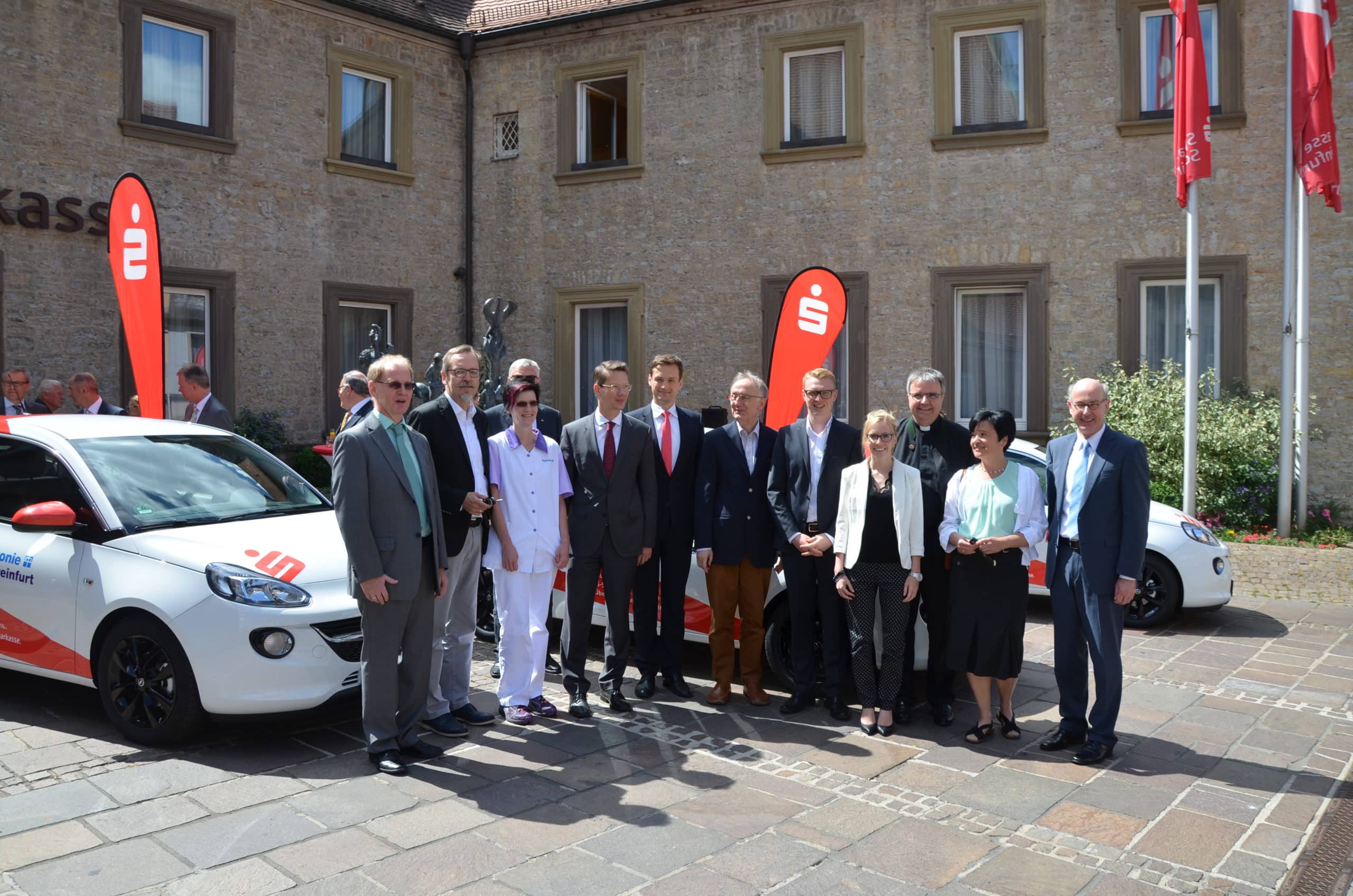 Das Foto zeigt von links: Georg Repp (stv. Geschäftsführer Antonia-Werr-Zentrum GmbH), Pfarrer Jochen Keßler-Rosa (Geschäftsführer Diakonisches Werk Schweinfurt e.V.), Sr. Nicole Seifert (stv. Pflegedienstleiterin Diakoniestation Schweinfurt-Stadt), Oberbürgermeister Sebastian Remelé, Landrat Florian Töpper, Herbert Baumer (stv. Leiter Caritas-Frühförderstelle), Mike und Lisa Löffler (Geschäftsführer Auto Löffler GmbH), Domkapitular Clemens Bieber (1. Vorsitzender Caritasverband für die Diözese Würzburg e.V.), Margot Kirchner (Caritas-Frühfördertelle), Vorstandsvorsitzender Johannes Rieger