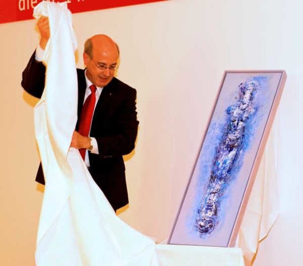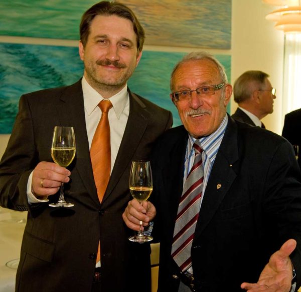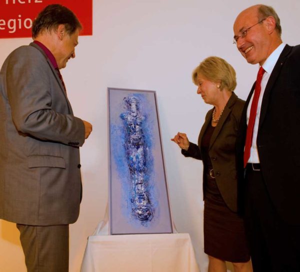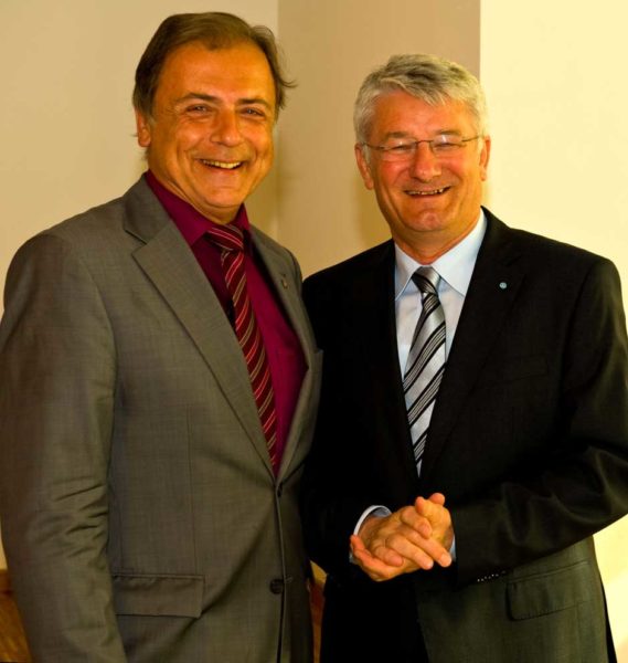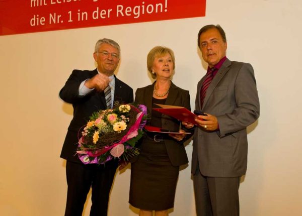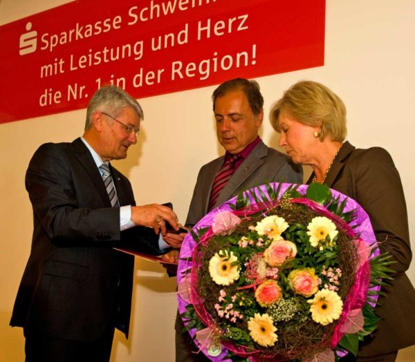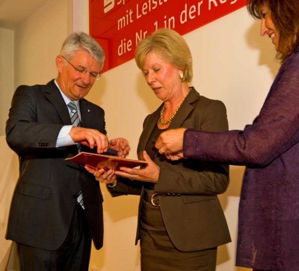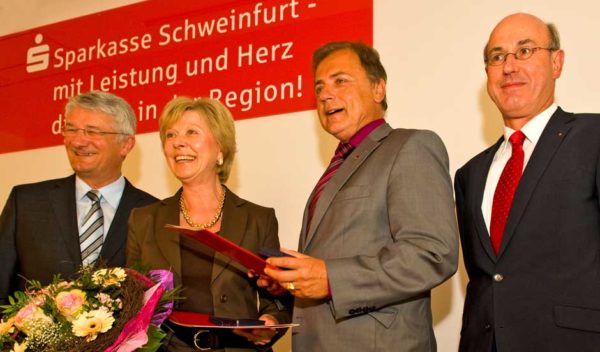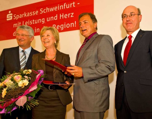 Schweinfurt: Oberbürgermeisterin Gudrun Grieser erhielt zusammen mit Landrat Harald Leitherer gestern Abend aus der Hand des neuen Präsidenten des bayerischen Sparkassenverbands, Theo Zellner, die Sparkassenmedaille in Gold.