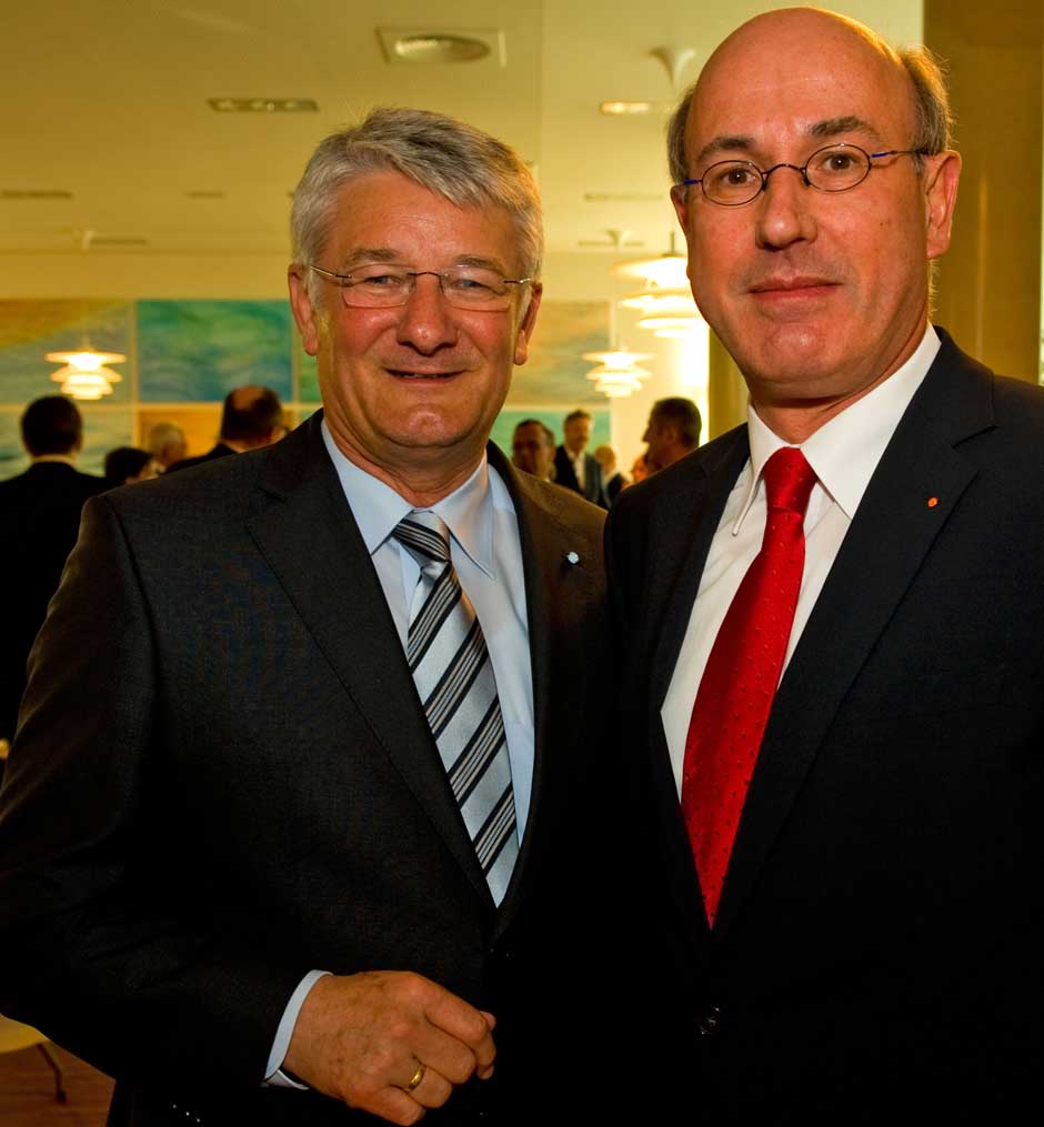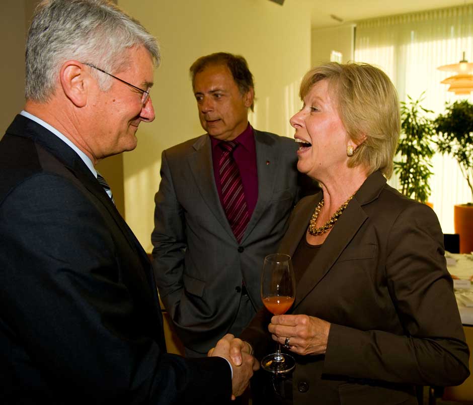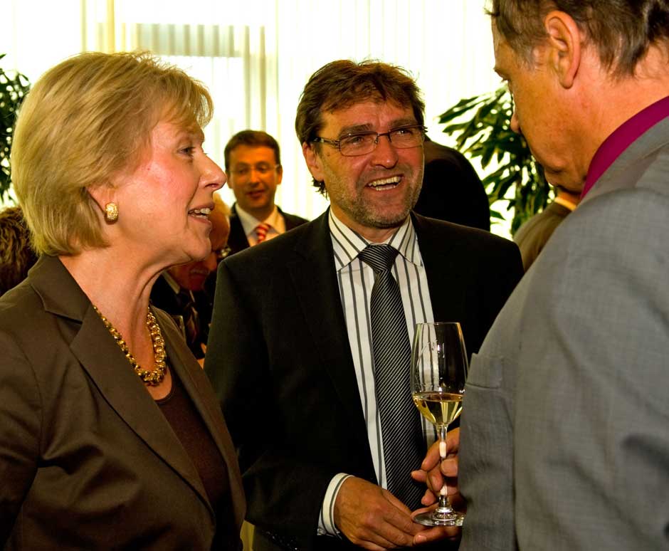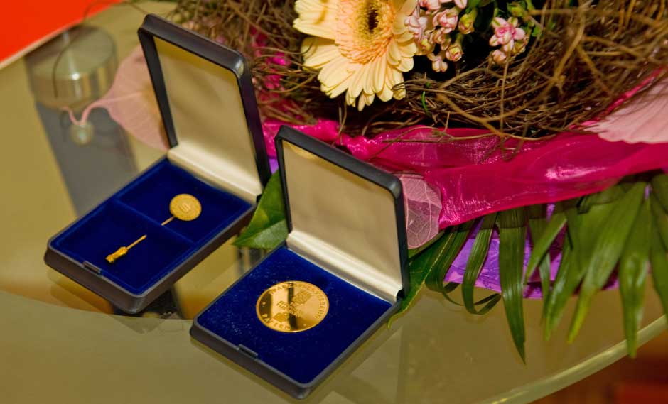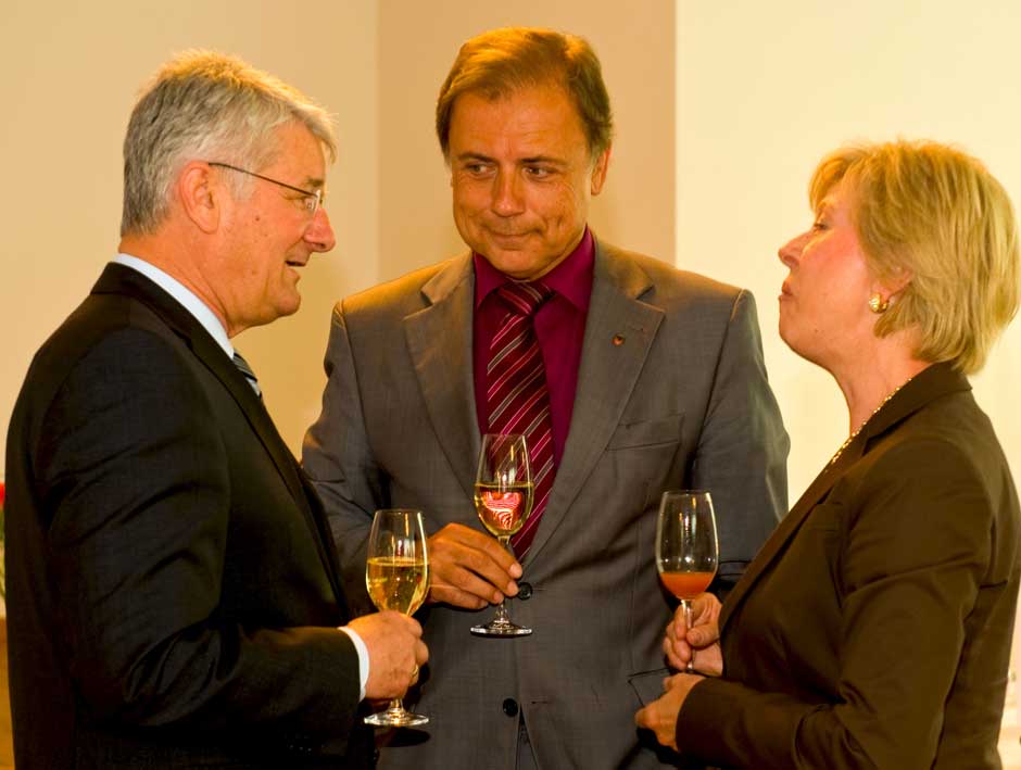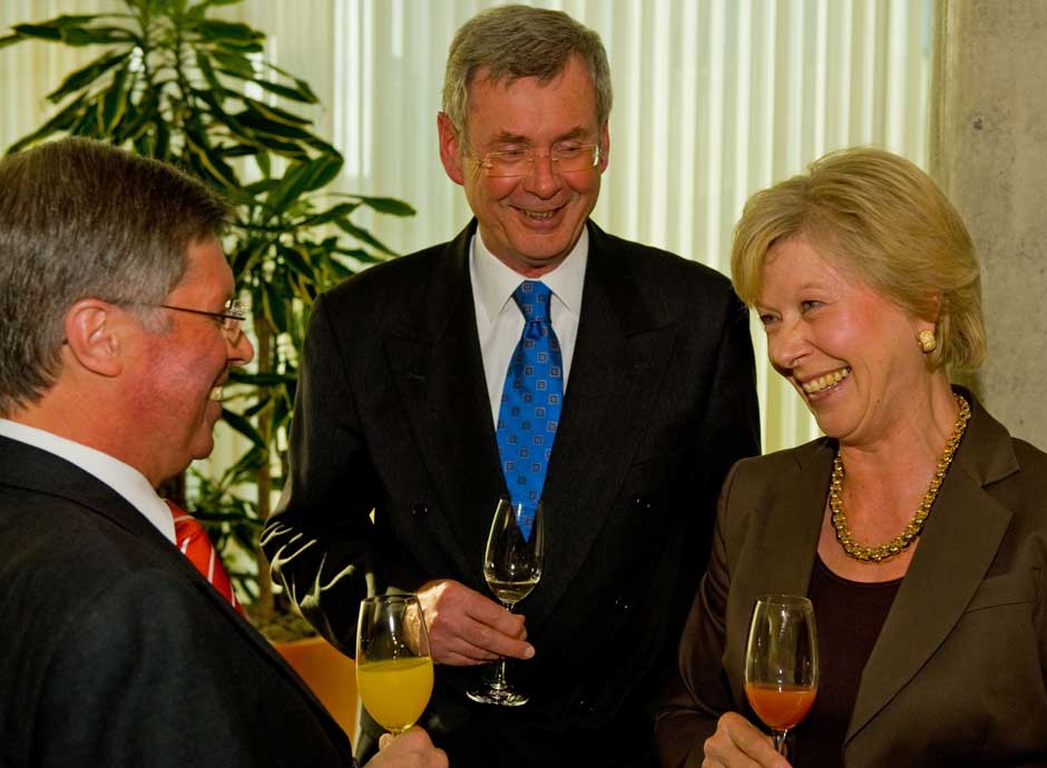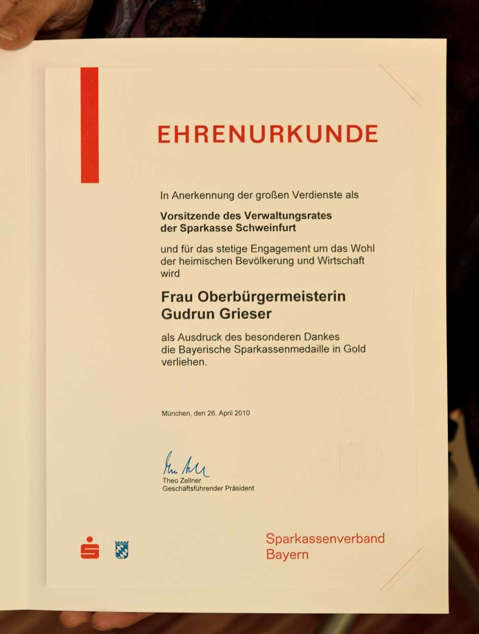 Schweinfurt: Oberbürgermeisterin Gudrun Grieser erhielt zusammen mit Landrat Harald Leitherer gestern Abend aus der Hand des neuen Präsidenten des bayerischen Sparkassenverbands, Theo Zellner, die Sparkassenmedaille in Gold.