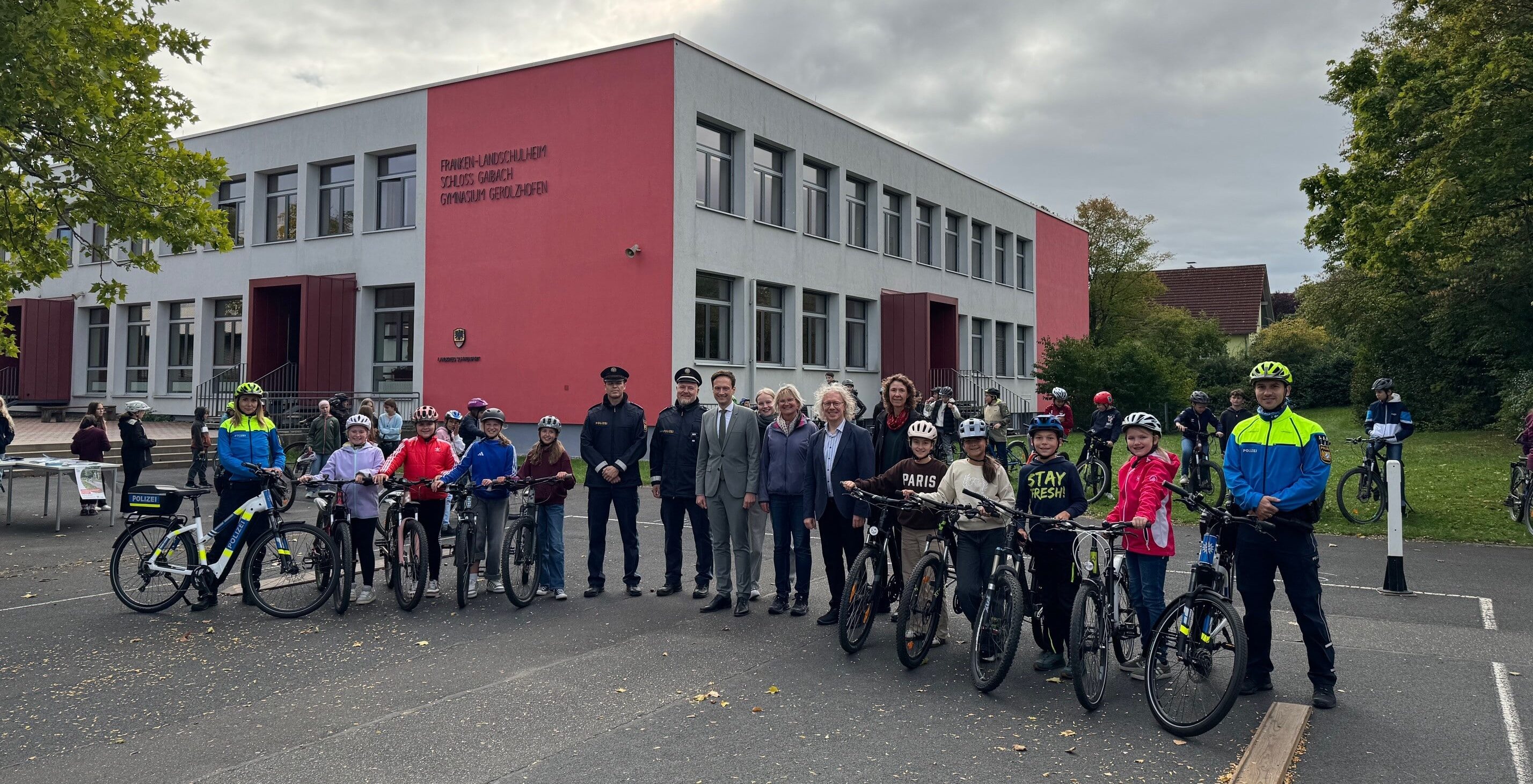 Im Bild, von links: Irene Wölfel (Verkehrspolizei Gerolzhofen) mit Schülerinnen des Gymnasiums Gerolzhofen, Christian Pretscher (Polizei Gerolzhofen), Bernhard Warmuth (Dienststellenleiter Polizeiinspektion Gerolzhofen), Landrat Florian Töpper, Hanna Bosch (Studienpraktikantin Landratsamt Schweinfurt), Ursula Schmidt (Radverkehrsbeauftragte Landkreis Schweinfurt), Martin Reisinger (Schulleiter des Gymnasiums Gerolzhofen, Außenstelle des Landschulheims Gaibach), Petra Sokol-Pemöller (Ständige Stellvertreterin der Schulleitung) sowie weitere Schülerinnen und Schüler des Gymnasiums mit Michael Kraft von der Verkehrspolizei Gerolzhofen.