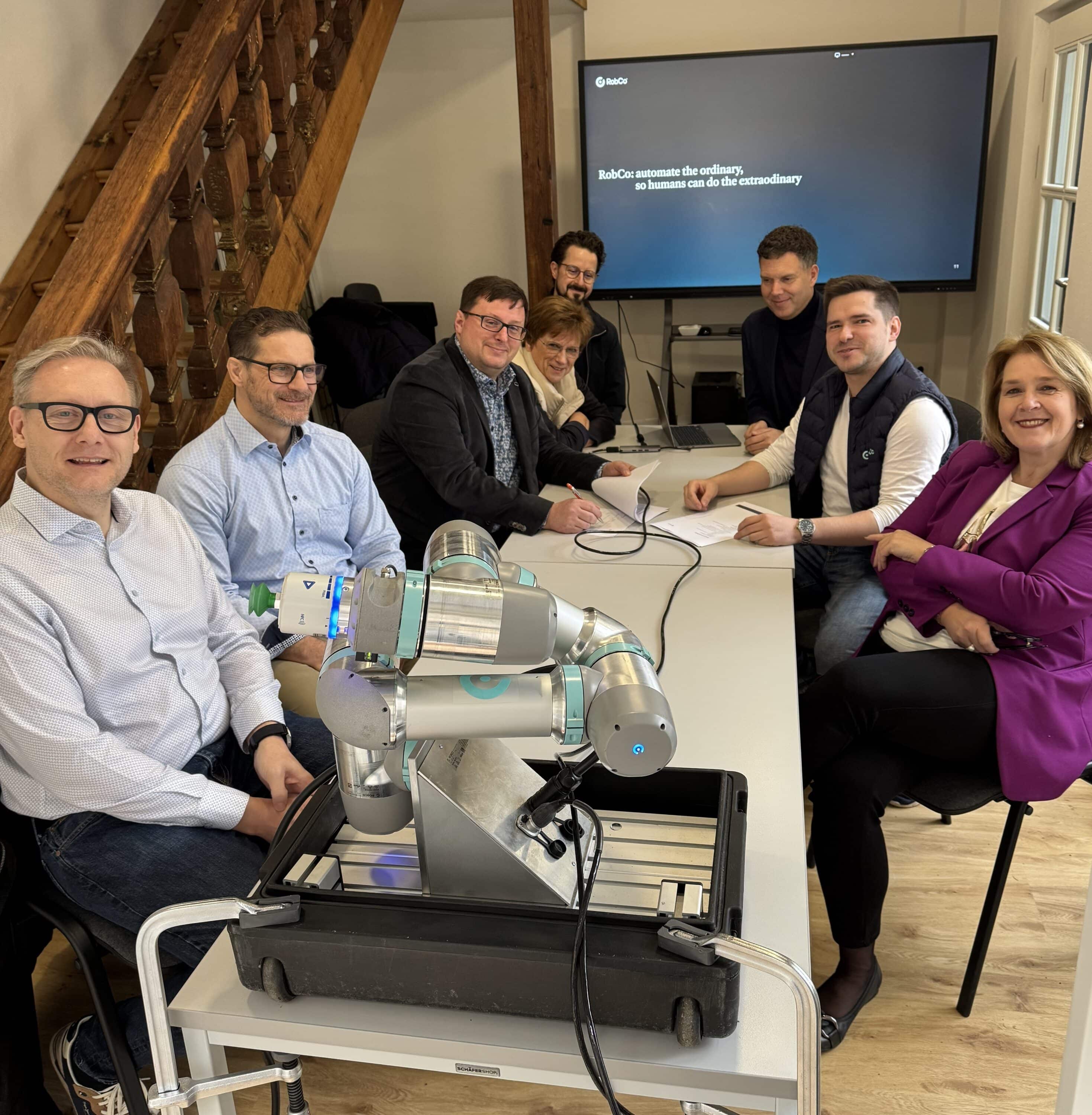 Foto: Die Unternehmen P & K Döring Systems GbR und RobCo bringen Robotik-Innovation nach Schweinfurt. Unser Foto entstand bei der Vertragsunterschrift und zeigt v.l.: Dr. Martin Lenhardt, Prof. Volker Bräutigam, Patrick Döring, Klara Weigand, Thomas Arbter (Mitarbeiter StadtFABrik), CSU-OB-Kandidat Oliver Schulte, Moritz Weigand (RobCo) und MdL Martina Gießübel.    Foto: Katja Eden