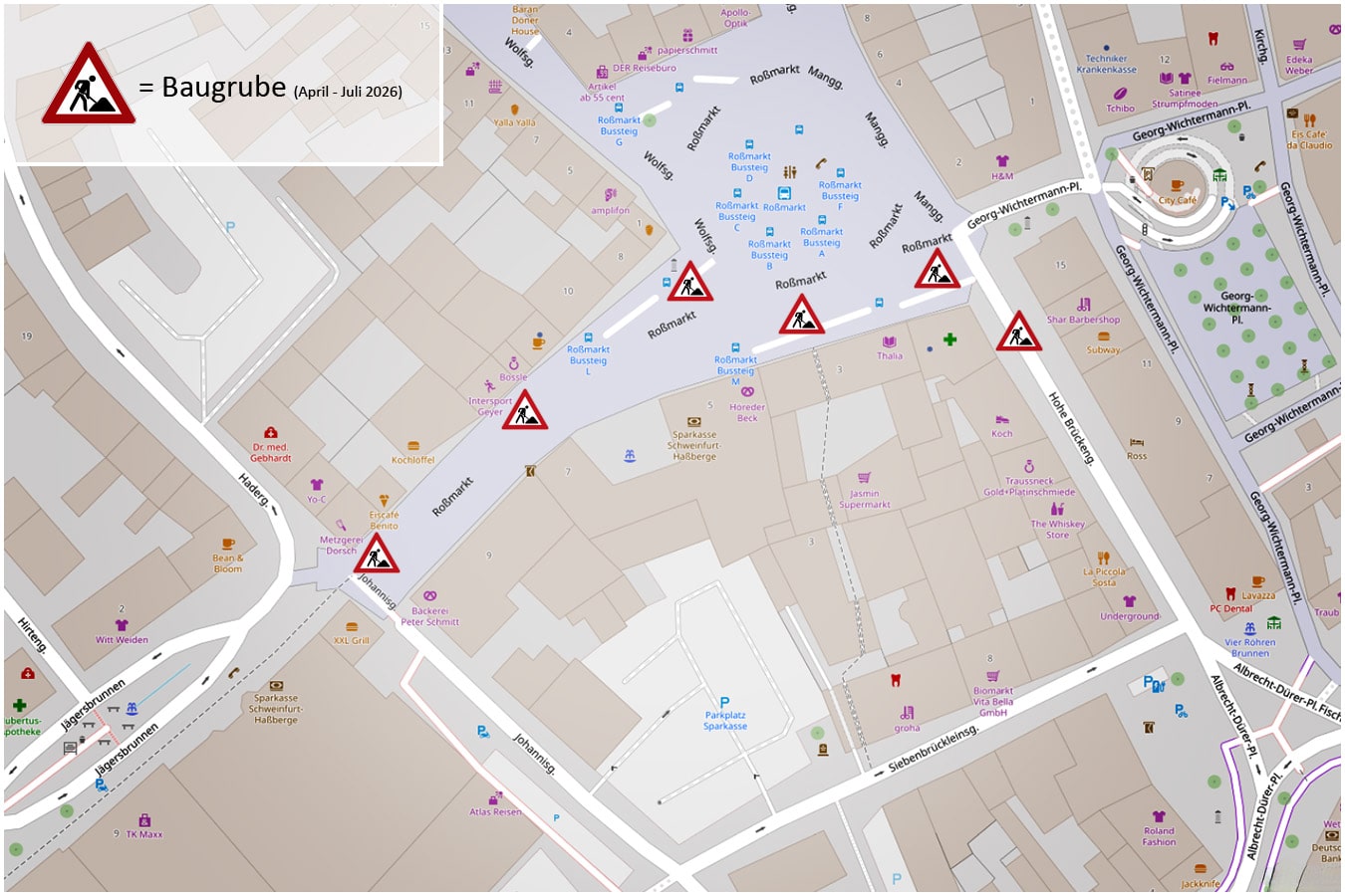 Die Bauarbeiten sind für den Zeitraum von Ende April bis September 2026 vorgesehen. Für die Leitungsarbeiten werden mehrere Baugruben eingerichtet. Der Zugang zu allen Wohn- und Geschäftsgebäuden bleibt während der gesamten Bauzeit gewährleistet. Der Kundenverkehr zu den betroffenen Geschäften ist jederzeit möglich. Auch der Busverkehr im Bereich Roßmarkt kann aufrechterhalten werden. Um dies sicherzustellen, sind temporäre Anpassungen im Straßenraum notwendig. Dazu gehört die zeitweise Entfernung der Außenbestuhlung im Bereich der Metzgerei Dorsch, der Bäckerei Schmitt, des Kebab Hauses sowie des XXL Grill.