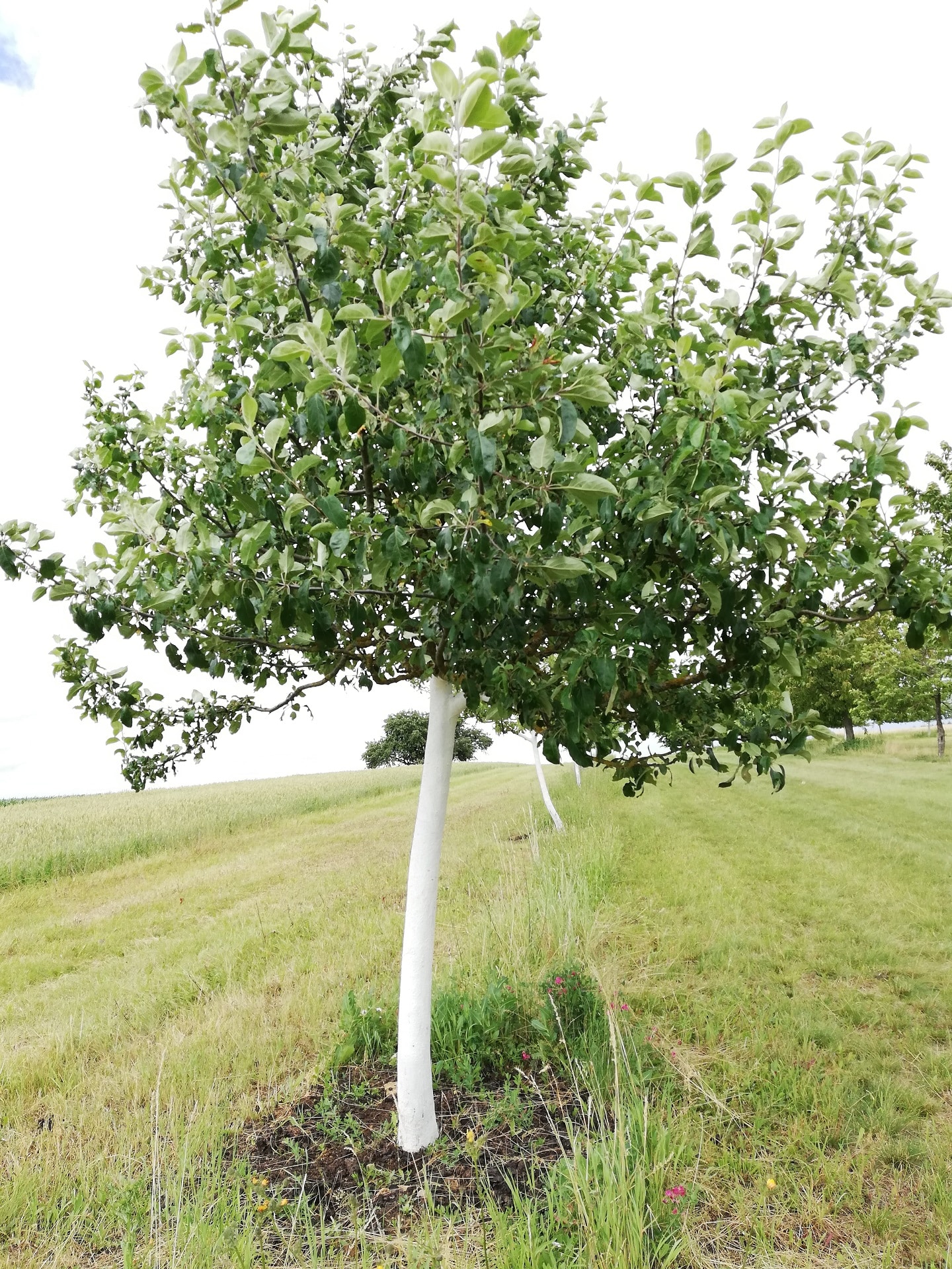 Mit wenigen Maßnahmen ist jeder Garten- und Obstwiesenbesitzer in der Lage die Bäume zu unterstützen, um gesund zu bleiben. Junge Obst- aber auch Hausbäume, die nicht mit ihrer Krone den Stamm beschatten, brauchen im Sommer einen Stammschutz beziehungsweise einen Sonnenschutz. Mit einem Weißanstrich wird das Sonnenlicht reflektiert und somit die Erwärmungsrate verringert. (Foto) Der klassische Kalkanstrich der Stämme blättert zwar innerhalb weniger Wochen oder nach Starkregen wieder ab, ist aber absolut umweltfreundlich.