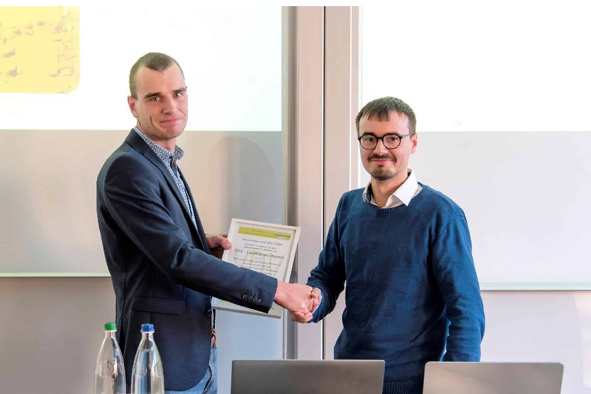 Die Masterarbeit von Felix Düßel (re.) wird vom Verband Deutscher Vermessungsingenieure (VDV) gewürdigt. Prof. Lukas Hart (li.) überreicht den Preis (Foto: THWS/Rainer Schäffner)