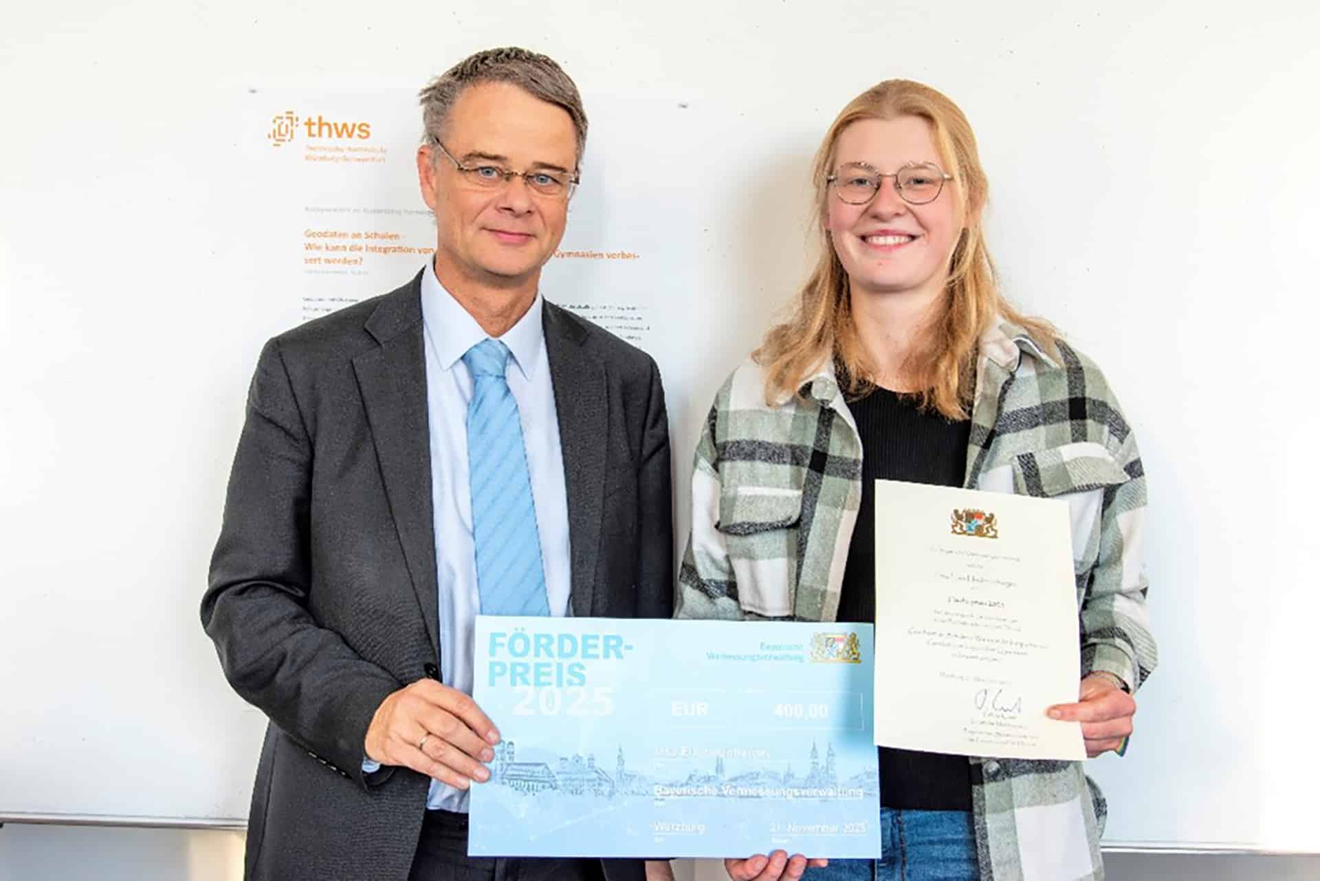 Tobias Kunst (li.) vom Bayerischen Staatsministerium der Finanzen und für Heimat überreicht den Förderpreis der Bayerischen Vermessungsverwaltung an Lisa Flachsenberger (re.) (Foto: THWS/Rainer Schäffner)