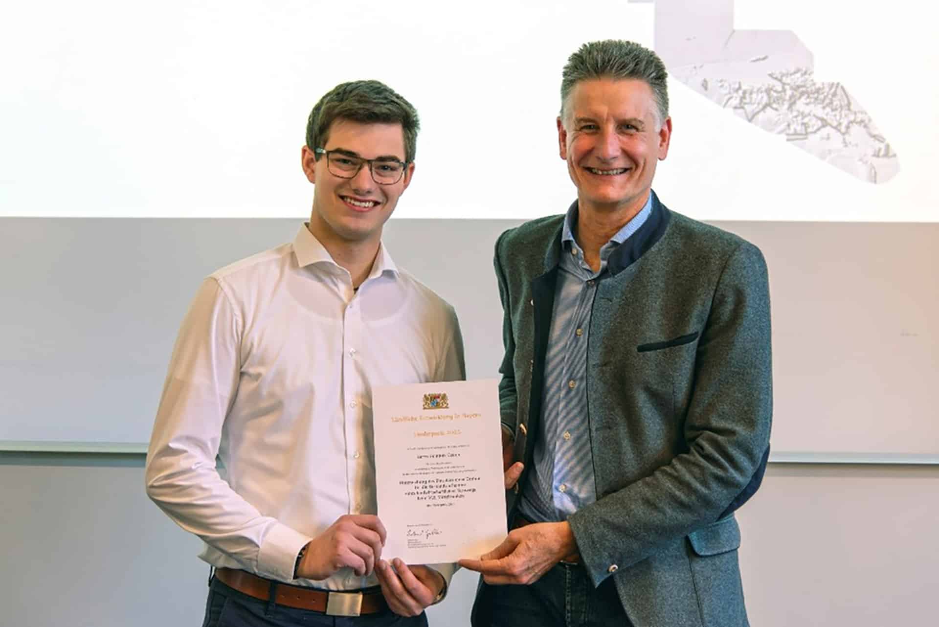 Stephan Wiediger (re.) vom Bayerischen Staatsministerium für Ernährung, Landwirtschaft, Forsten und Tourismus (StMELF) prämiert Dominik Gedon (li.) für seine Bachelorarbeit (Foto: THWS/Rainer Schäffner)