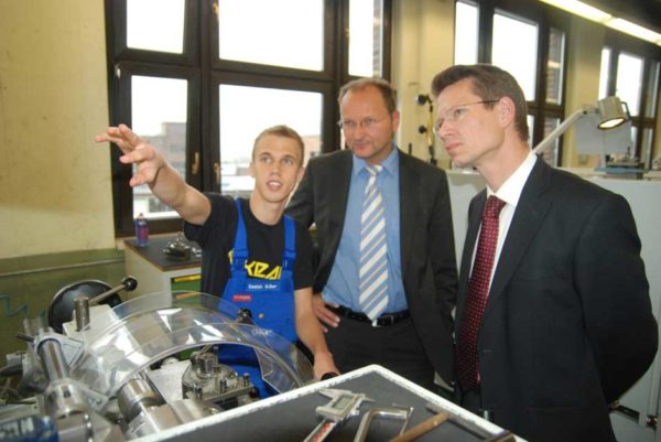 „Bei die Schweden“ heißt es oft, was Remelé bei Jubilarbesuchen zu hören bekommt. Nicht selten arbeiten Großvater, Sohn und auch der Enkel bei SKF. „Gute Löhne, der hohe Grad der Qualifikation und die langfristige Perspektive für junge Leute aus allen Schularten“ macht der Oberbürgermeister verantwortlich für das Interesse der jungen Leute, den Beruf eines Industrie- oder Zerspanungsmechanikers, eines Mechatronikers oder Energieelektronikers zu erlernen. Gerade auch Hauptschülern bietet SKF eine gute Chance. 250 Schnupperschüler können sich jedes Jahr eine Woche lang beruflich im Unternehmen orientieren. „Bübchen mit 12, 13 Jahren kommen da und bewerben sich dann zwei, drei Jahre später bei uns“, weiß Ausbildungsleiter Jürgen Stürzenberger aus Erfahrung. Der hohe Stellenwert der Ausbildung in Schweinfurt hat sich längst bis ins obere Management in Schweden herumgesprochen, genauso die Bereitschaft, auch in schwierigen Zeiten alle Auszubildenden und Studenten unbefristet zu übernehmen. „Auch in Jahren, als wir deutlich über Bedarf ausbilden durften“, erklärt Arbeitsdirektor Wolfgang Gollbach.