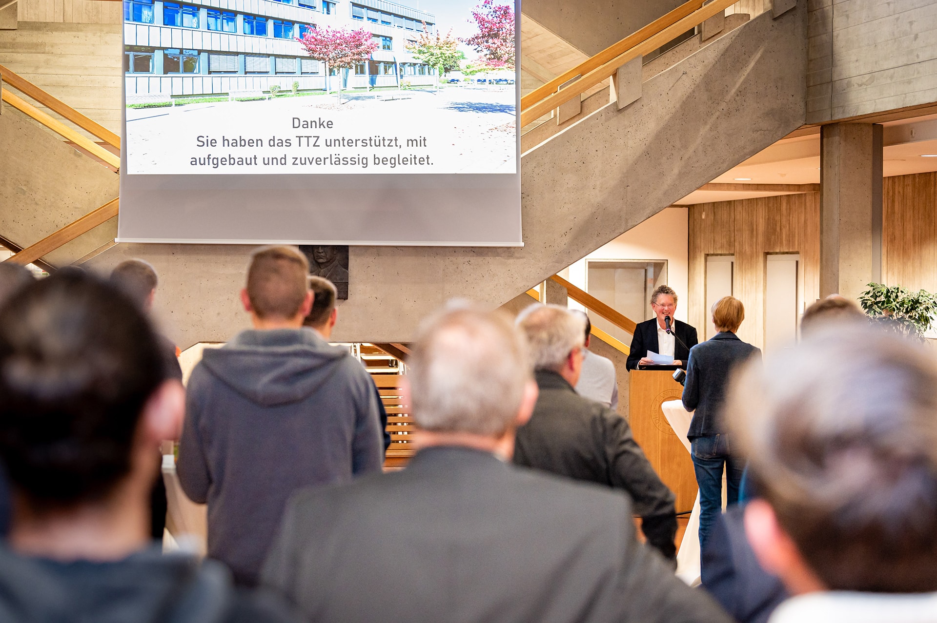 Mittlerweile erwirtschaftet das TTZ-EMO rund 1,5 Mio. Euro Drittmittel pro Jahr und kann auf mehr als 80 wissenschaftliche Publikationen zurückblicken sowie 13 abgeschlossene und sieben laufende Promotionen. Außerdem ist aus der angewandten Forschung mit der tetranes GmbH eine Ausgründung entstanden. Prof. Dr. Ackva betonte: „Mein Dank gilt der Politik – ohne die politische Unterstützung vor Ort und in München wäre das nicht möglich gewesen.“ Er dankte außerdem den Stiftern und Industrievertretern sowie seiner Familie, die oft habe zurückstehen müssen.