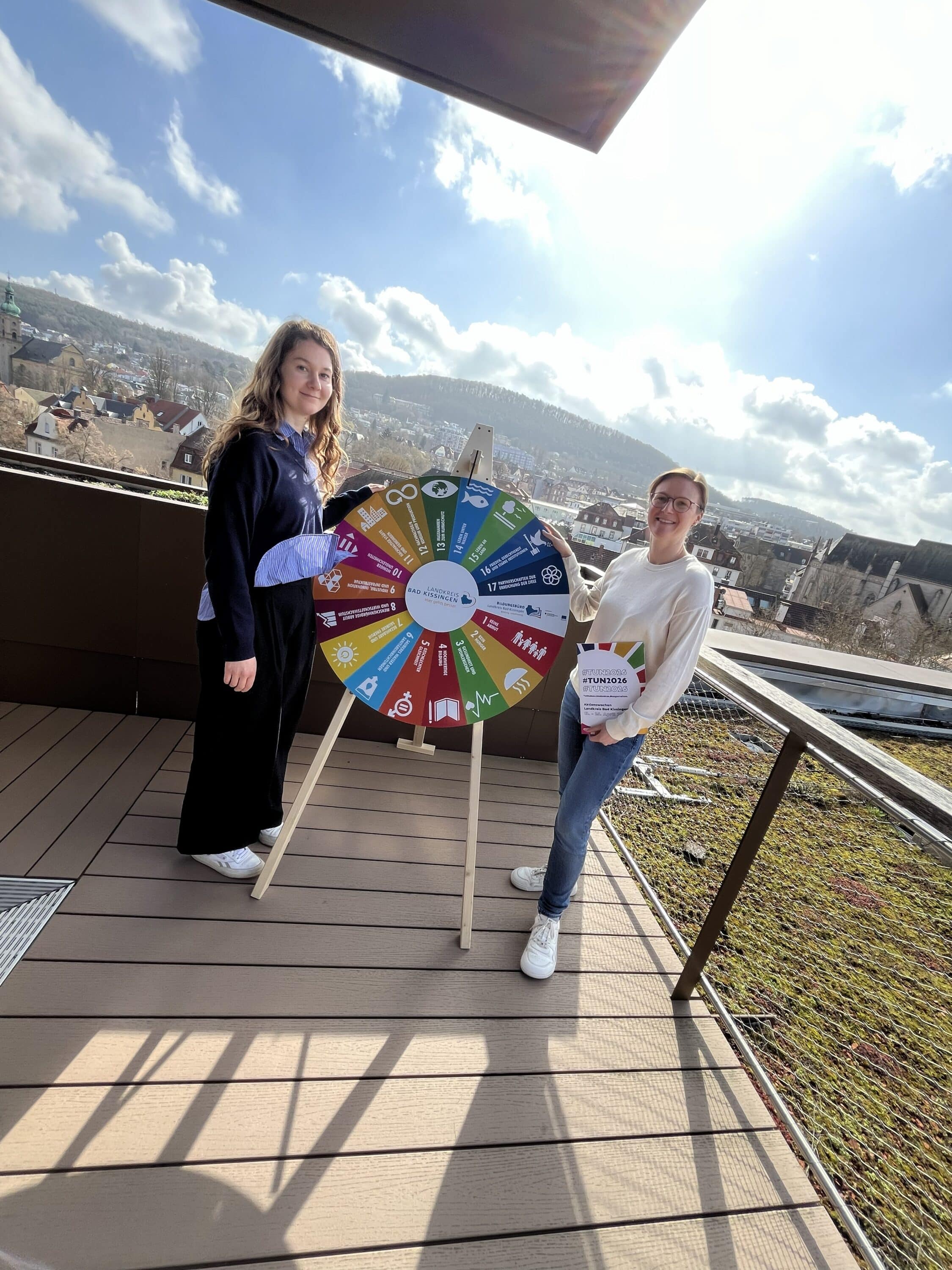 Bild: Franziska Kaufmann (von links) und Bianca Schmitt vom Bildungsbüro mit dem Nachhaltigkeitsglücksrad. Foto: Landkreis Bad Kissingen/Leopold Werner