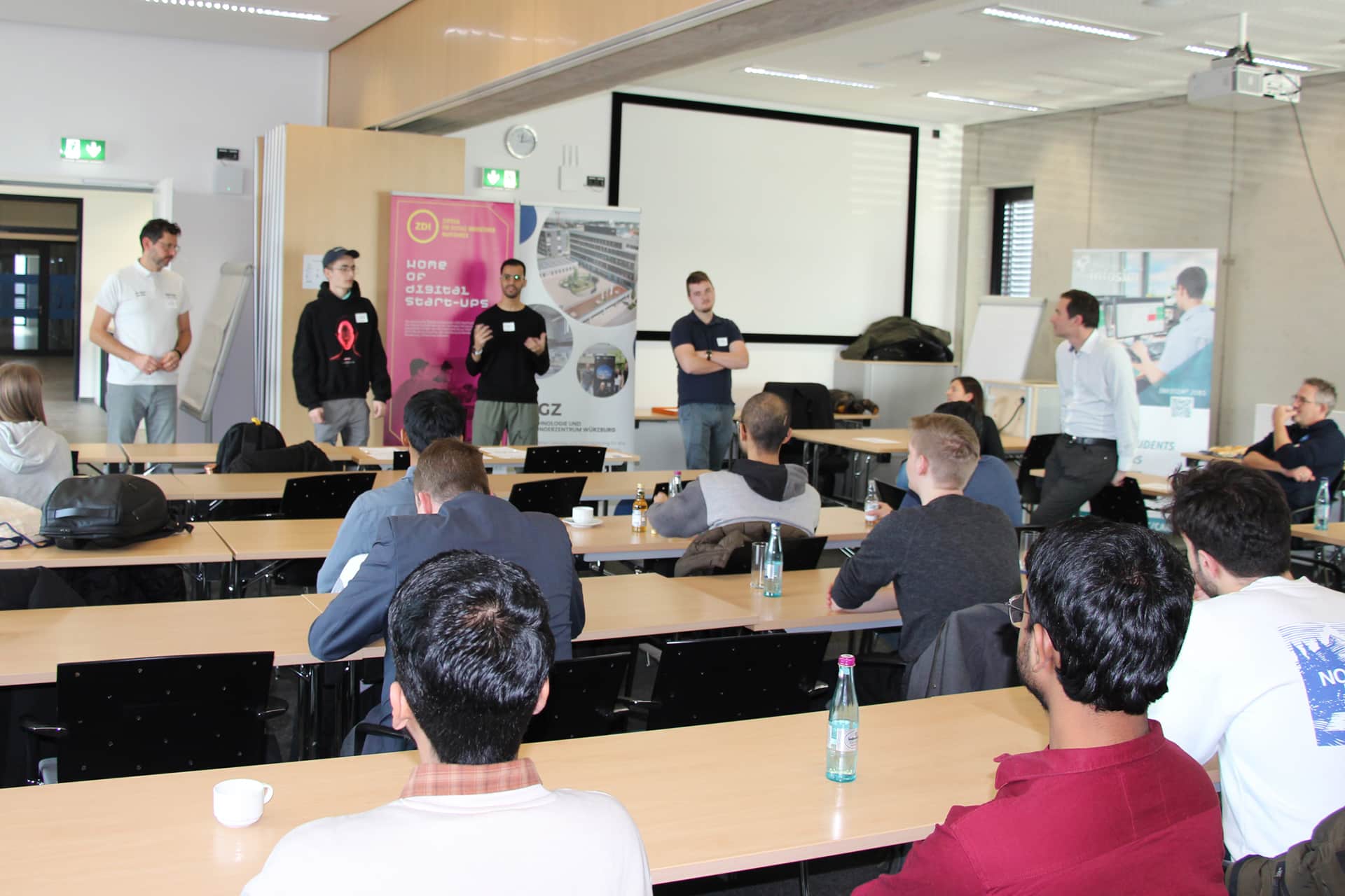 Ob etablierte Firmen oder junge Start-ups – insgesamt stellten sich Vertreterinnen und Vertreter von 13 Unternehmen der Würzburger Region den Studierenden vor. Daneben lernten diese auch die drei Gründerzentren IGZ, TGZ und ZDI kennen. Im Anschluss konnten sich die Studierenden direkt mit den Firmen austauschen und Informationen über potenzielle Karrieremöglichkeiten bekommen.
