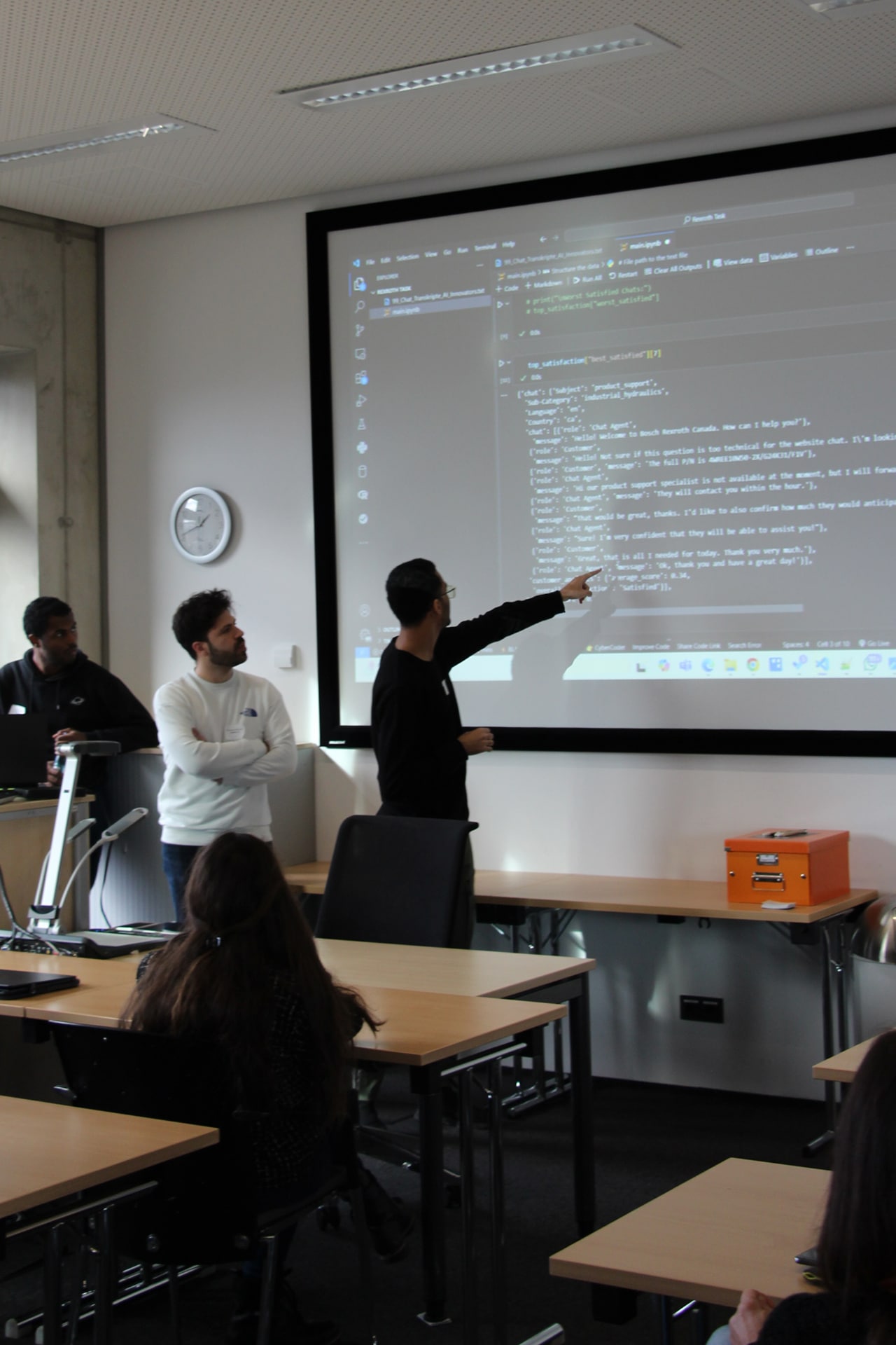 Für den zweiten Teil des AI-Innovators Student-Company Collaboration Days überlegten sich vier Unternehmen jeweils eine Aufgabe für die Studierenden. In Teamarbeit erstellten diese Konzepte, die sie im Anschluss den Firmenvertreterinnen und -vertretern präsentierten. Zum Beispiel lautete die Challenge von Bosch Rexroth, anonymisierte Kundenchats von der Website von Bosch Rexroth zu analysieren. Für die Ausarbeitungen, etwa in den Bereichen Tonalität oder Kategorie, bekamen die Studierenden ein direktes Feedback seitens Stefan Lehnert und Ulla Niklaus von Bosch Rexroth. Beide bedankten sich stellvertretend für das Engagement in dieser Challenge mit technischen Give-aways.