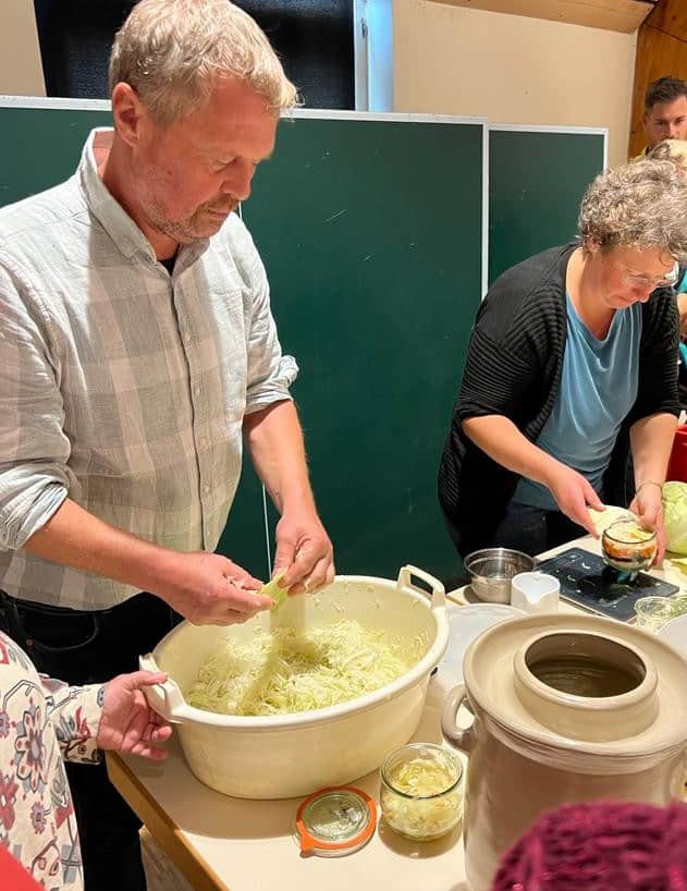 Christina Fallenbacher und Guntram Ulsamer beim Fermentieren von Kraut und Gemüse
