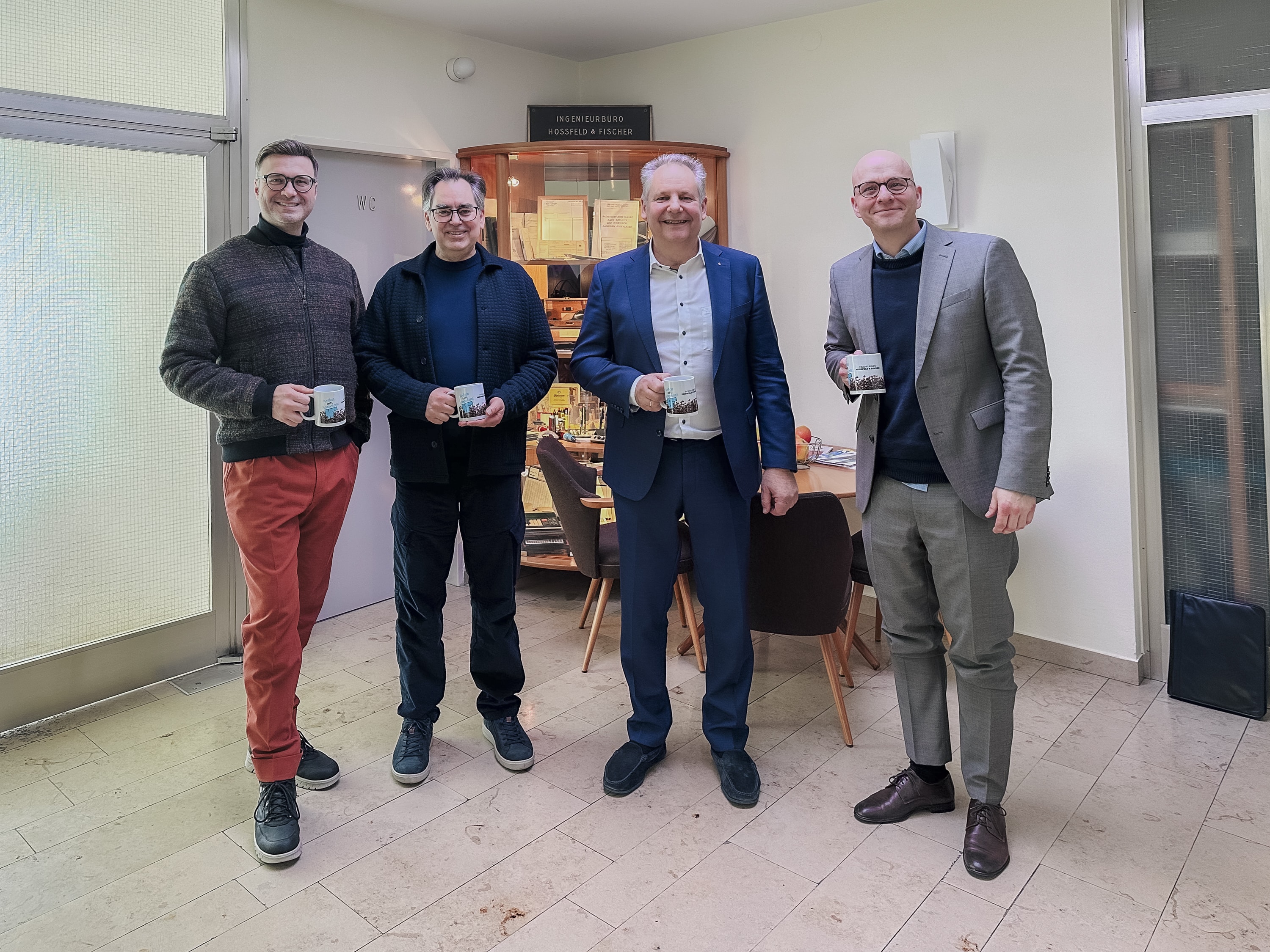 Titelbild: Oberbürgermeister Dr. Dirk Vogel (rechts) und Wirtschaftsförderer Sebastian M. Bünner (links) besuchten das Ingenieurbüro Hoßfeld & Fischer mit den geschäftsführenden Gesellschaftern Herrn Dipl.-Ing. (Univ.) Hans-Ulrich Hoßfeld (Zweiter von rechts) und Herrn Dipl.-Ing. (FH) Andreas C. Fischer (Zweiter von links).