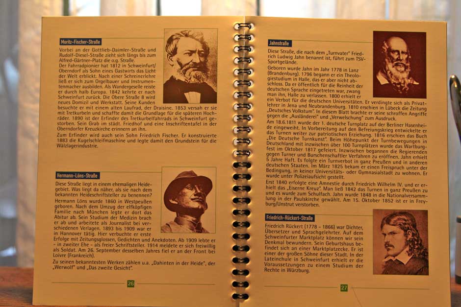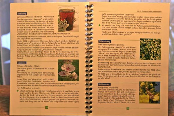 Nicht lange rätseln muss man auch bei Namen wie Industriestraße oder Gochsheimer Weg, die nach ihrer Funktion benannt sind. Auch die nach Blumen oder Bäumen benannten Straßen geben kaum Rätsel auf, den „Kräuterstraßen“ widmet das Buch ebenfalls eigene kleine Kapitel. Hier wird nicht nur ihre Anbaugeschichte im Apothekergärtlein Frankens beschrieben, sondern auch gleich ihre Wirkung: Angelika oder Engelwurz bei Verdauungsbeschwerden, Baldrian bei Unruhezuständen oder Eibisch bei Erkrankungen der Atemwege.