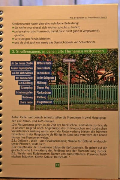 Reich bebildert und gut zu lesen gibt es Einblick in das Ortsgeschehen. Wer beispielsweise war Lucretia Wilhelmine von Bibra und was hat sie getan, dass ihr gleich zwei Straßen im Ort gewidmet wurden? Was hat es mit der Hadergasse auf sich? Wurde hier gerne gestritten oder wohnten dort früher lauter Haderlumpen oder ist es einfach nur die Straße, die zu einer Flur namens „Hader“ führte? Da ist die Bezeichnung vom Judenhof schon durchsichtiger, hier lebten seit dem 17. Jahrhundert die Schwebheimer Juden.