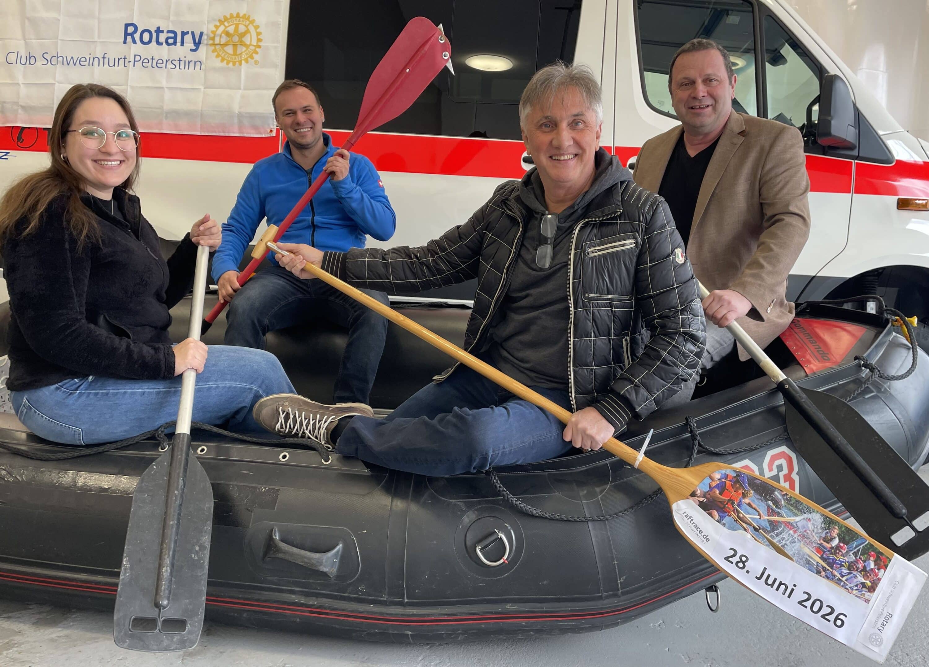 Bild (von links): Marcella Cicero (Vorsitzende Wasserwacht Sennfeld), Bastian Schenk (Technischer Leiter Wasserwacht Sennfeld), Manfred Pabst (Präsident Rotary Club Schweinfurt-Peterstirn) und Holger Merz (Vorsitzender Förderkreis Wasserrettung Sennfeld e.V.) können es kaum mehr erwarten, wie beim Raftrace in die Paddel zu greifen.