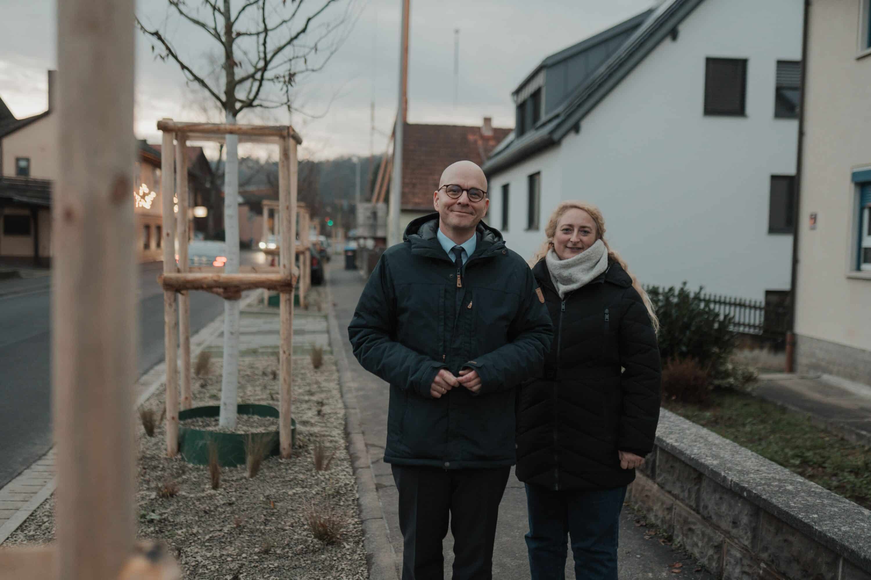 Titelbild: Oberbürgermeister Dr. Dirk Vogel und Christina Martin, vom städtischen Tiefbau, begutachteten die neu gepflanzten Bäume in der Hausener Straße.