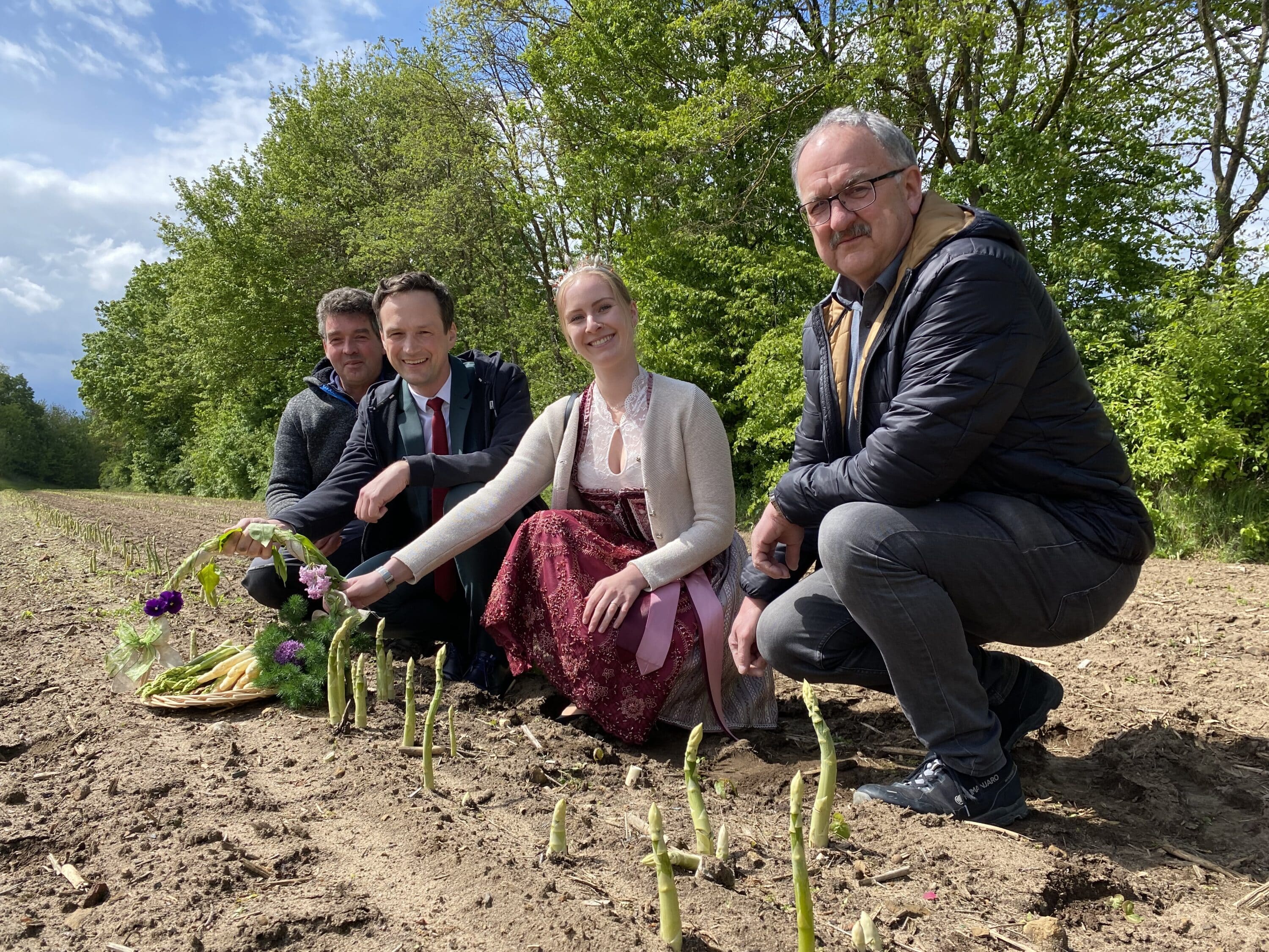 Freuen sich auf frischen Spargel aus dem Landkreis Schweinfurt: Rainer Büttner, Landrat Florian Töpper, Spargelprinzessin Lena Ziegler und 2. Bürgermeister Albrecht Dazer (von links) (Foto: Melanie Landgraf)