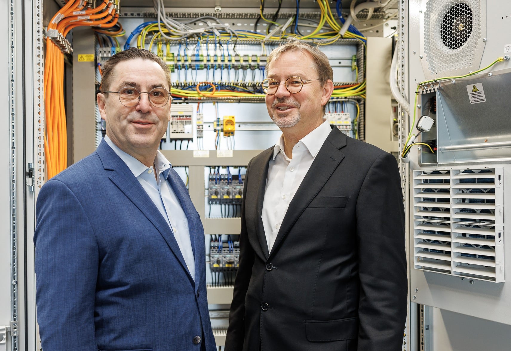 ZF und Axsol wollen kooperieren. Jürgen Zinecker, AXSOL-CEO, und Martin Mönig, ZF-Standortleiter, haben eine Absichtserklärung zur gemeinsamen Industrialisierung der Fertigung von MEC‐Energiespeichersystemen für kritische Infrastrukturen unterzeichnet